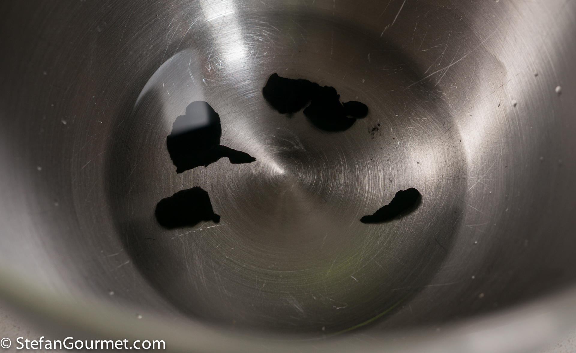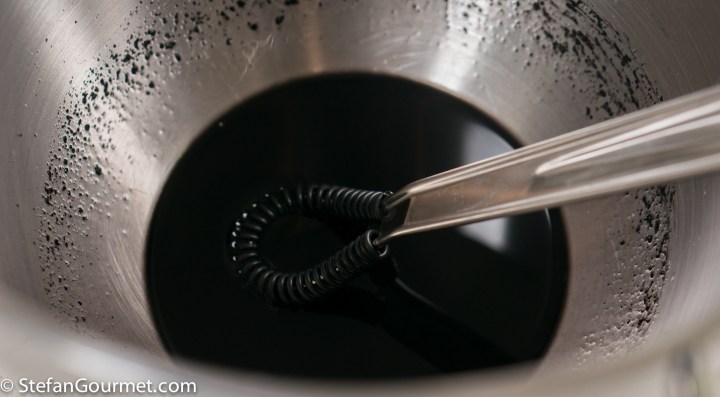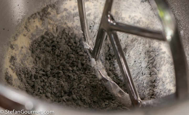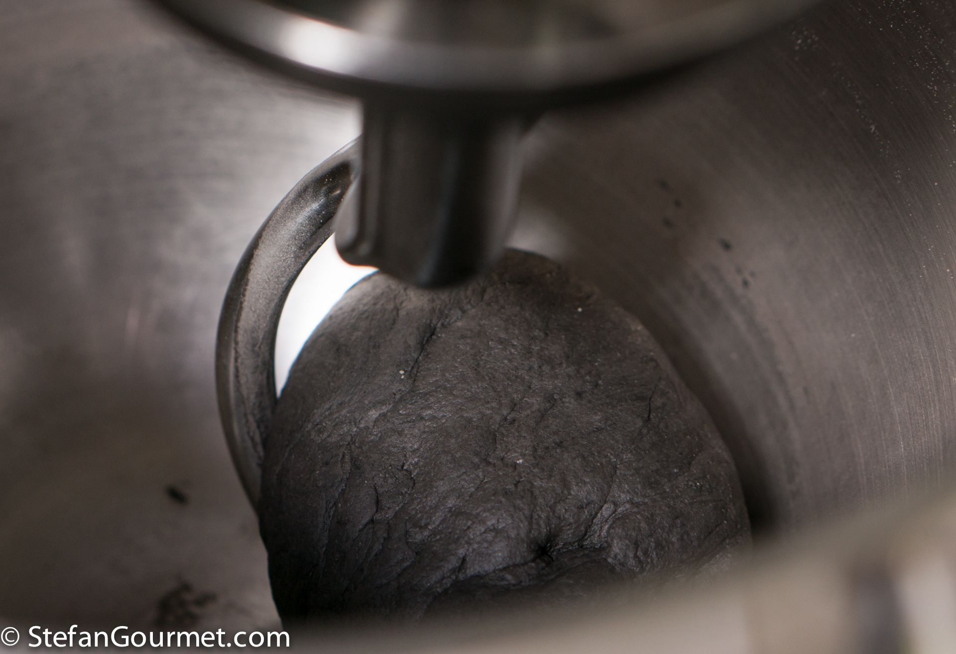 To make the pasta dough, put 80 ml of water in the bowl of a stand mixer and add the squid ink.