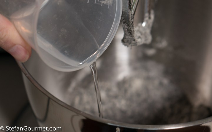 Use the paddle atachment to mix flour and water. You will probably end up with a crumbly mixture.