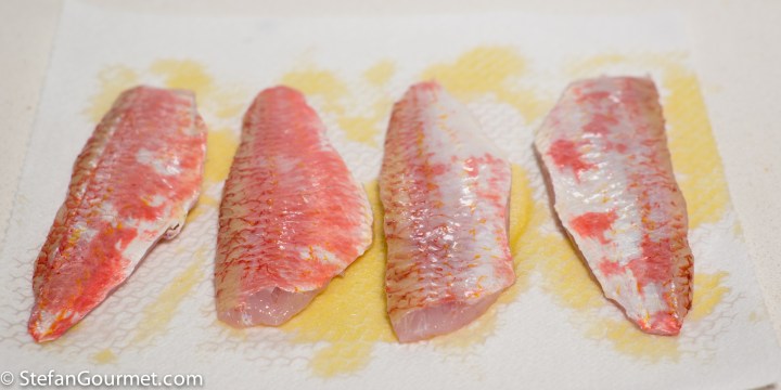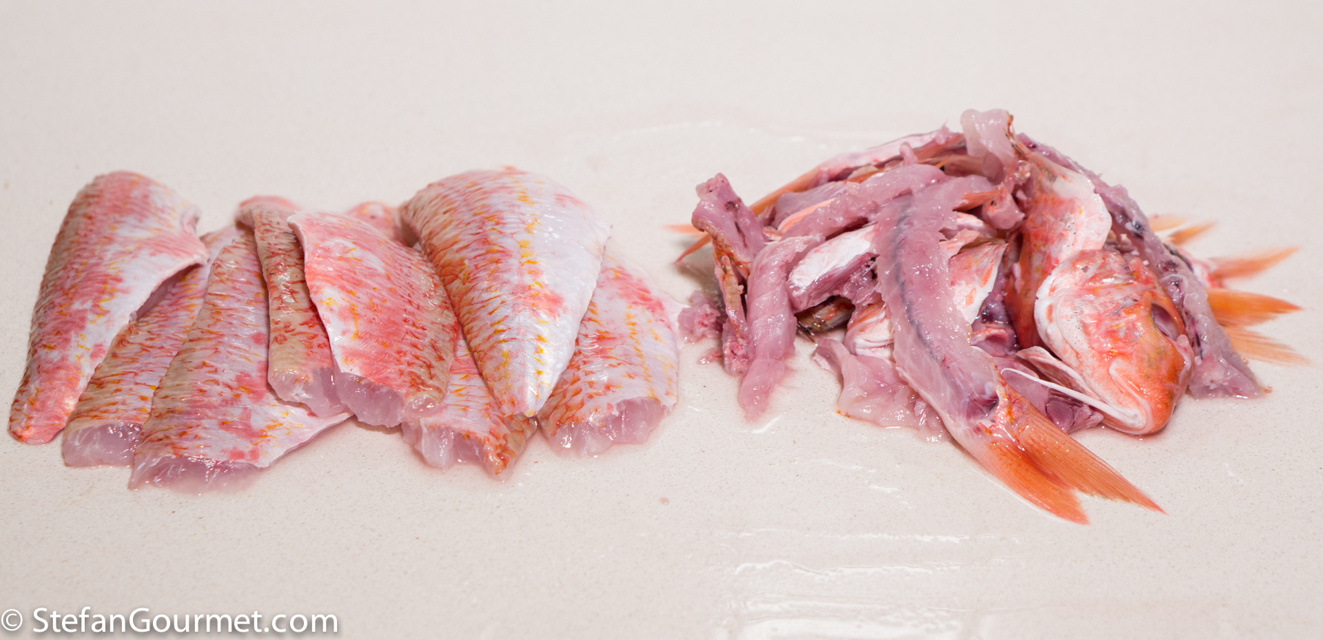 4 red mullets, about 800 grams (1.8 lbs) gross weight, filleted, heads and bones reserved for the stock