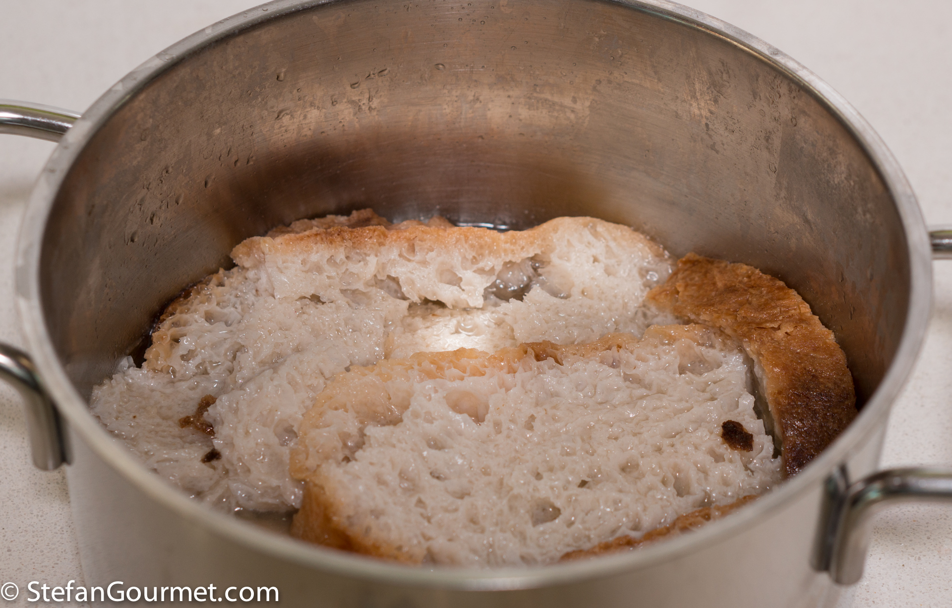 Once the fish stock is ready, soak the bread in it. When the bread is soft, squeeze out some of the excess fish stock (and reserve).