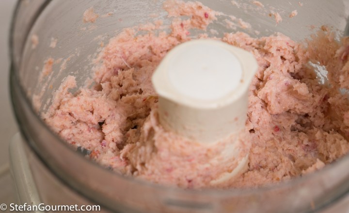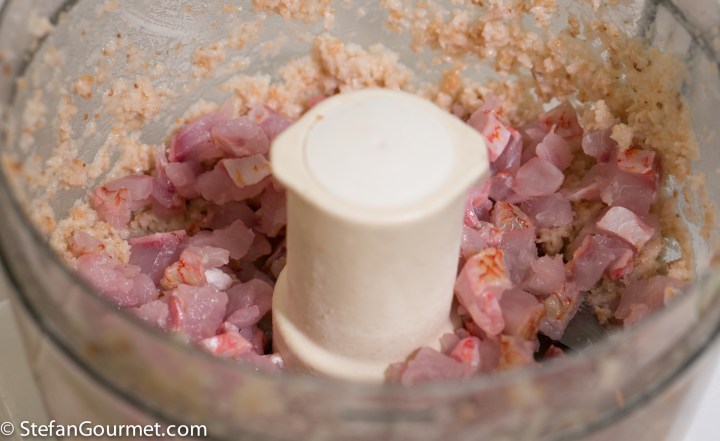 Put the soaked bread in a food processor together with half of the fish, chopped. Chopping the fish quite finely is important for making sure you don’t end up with longer pieces of skin the filling.