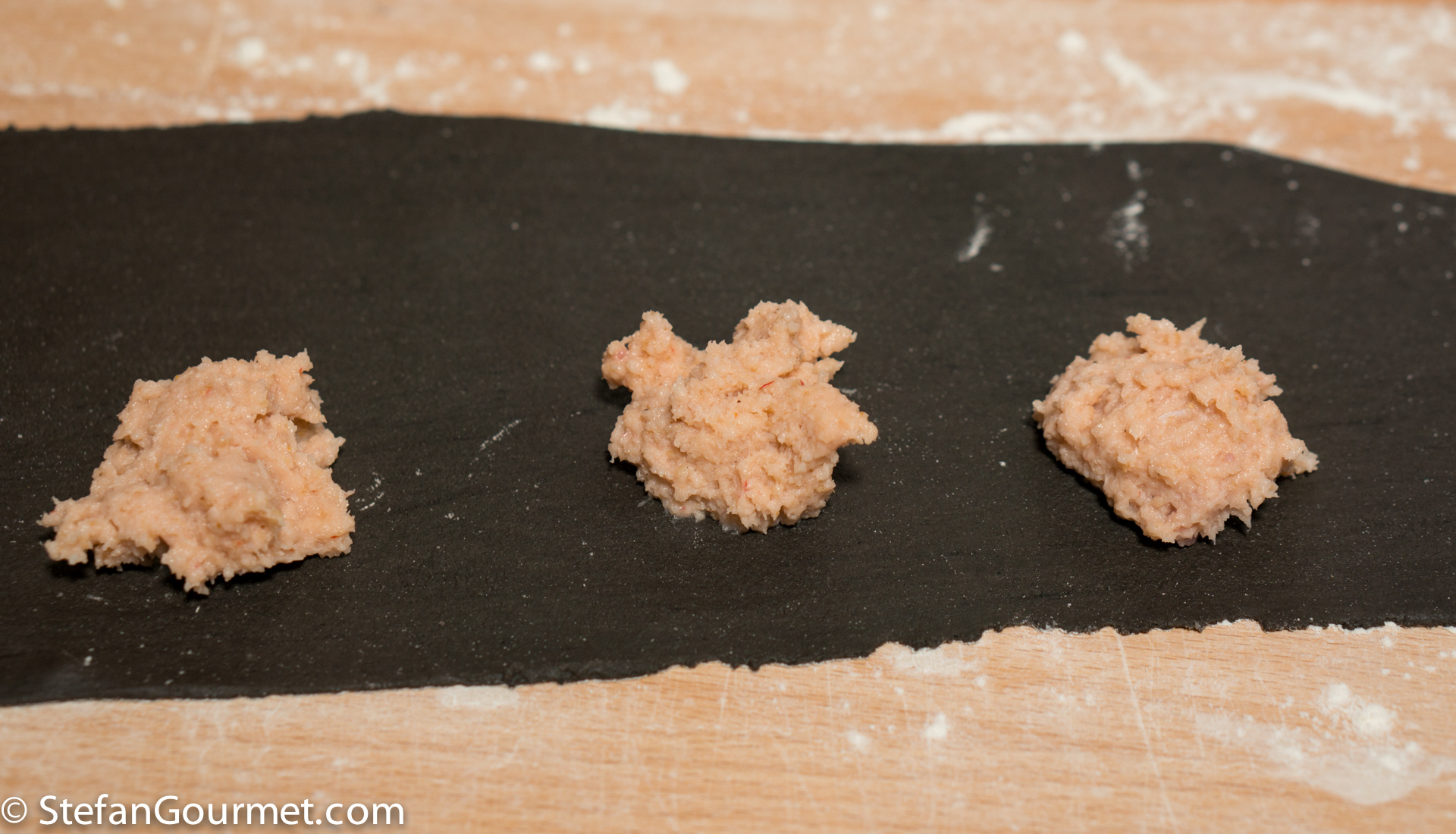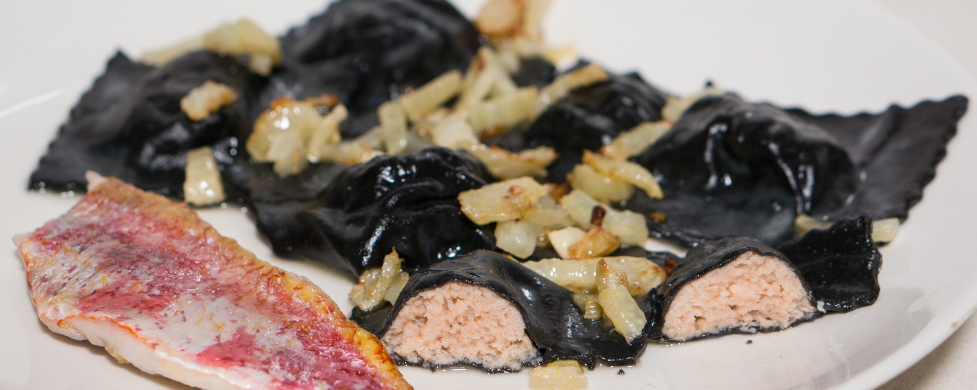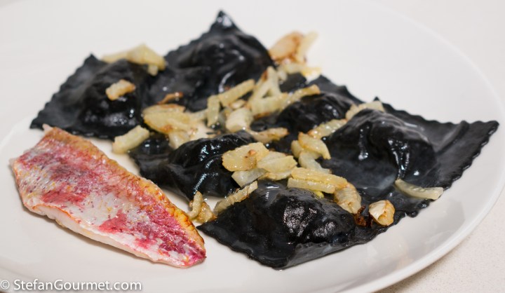 This dish was inspired by similar ravioli I had at Angiolina in Campania. It was listed as red mullet ravioli with fennel on the menu, but it was actually served with carrot and cherry tomatoes. Here I opted to use fennel as per the original. At Angiolina the red mullet was used both to fill to ravioli and for the ‘sauce’ to dress the ravioli. Fish ravioli need some kind of ‘filler’ to obtain a moist filling (just fish would make it dry). Mashed potatoes can be used for this, or bread soaked in milk or fish stock. To get more flavor, I opted for the latter. At Angiolina the pasta dough was colored with squid ink, which has a great dramatic effect. Even though the squid ink doesn’t really change the flavor, it does look great. As this was in Campania, I made the fresh pasta dough with semolina flour and water. The combination of the ravioli, fish, and fennel makes this a very nice dish. I was lucky enough to find red mullet that had been caught that morning, so it was extremely fresh and made the dish even nicer.