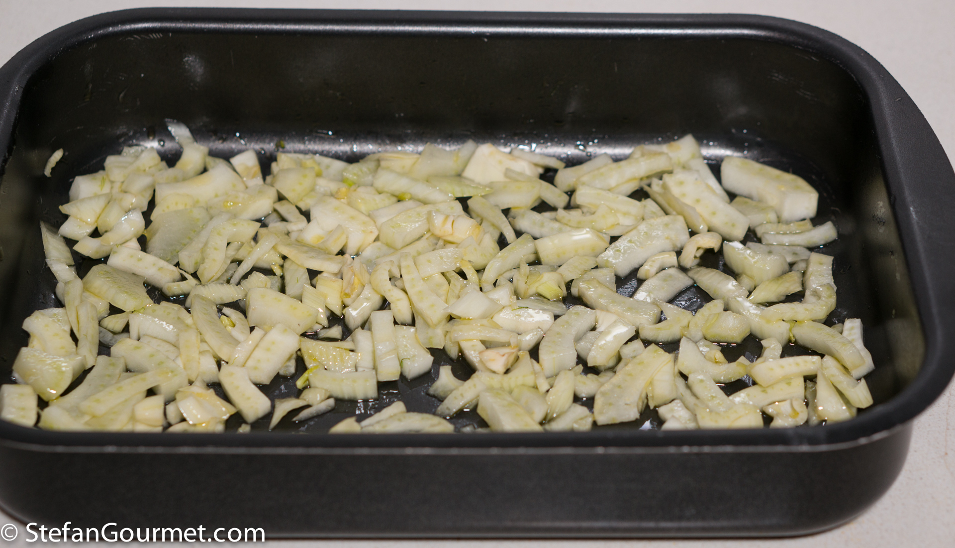 Preheat the oven to 225C/440F. In the meantime, chop the fennel and toss it with olive oil in an oven proof dish.
