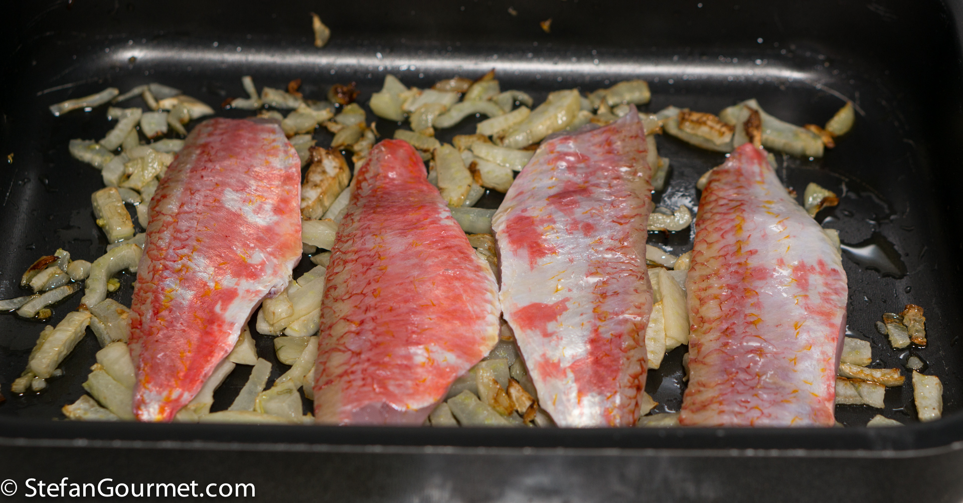 After 10 minutes, take the fennel out of the oven and stir. Season the fennel with salt. Arrange the red mullet on top. Now return to the oven for 5 minutes only to cook the mullet and finish cooking the fennel, not longer to avoid overcooking the mullet.