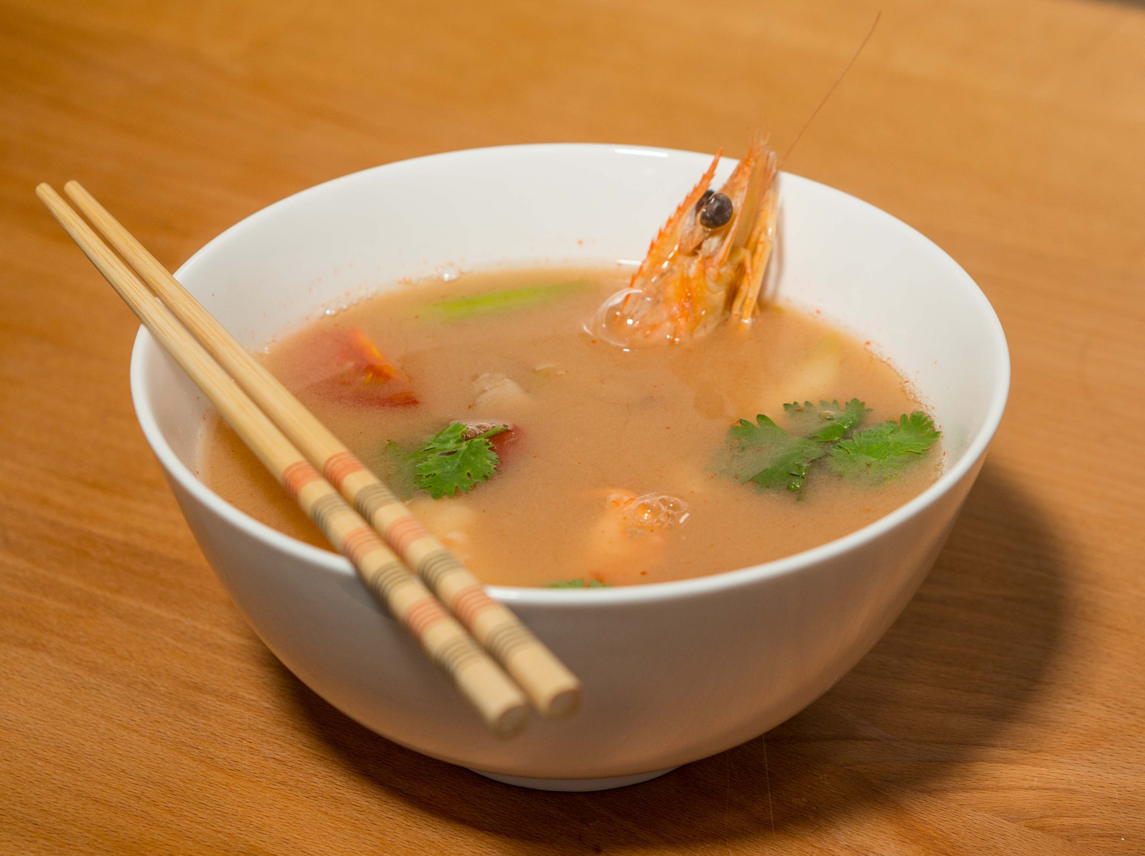 Tom yum goong is a sour (from lime) and spicy (from chillis) Thai soup with shrimp.
