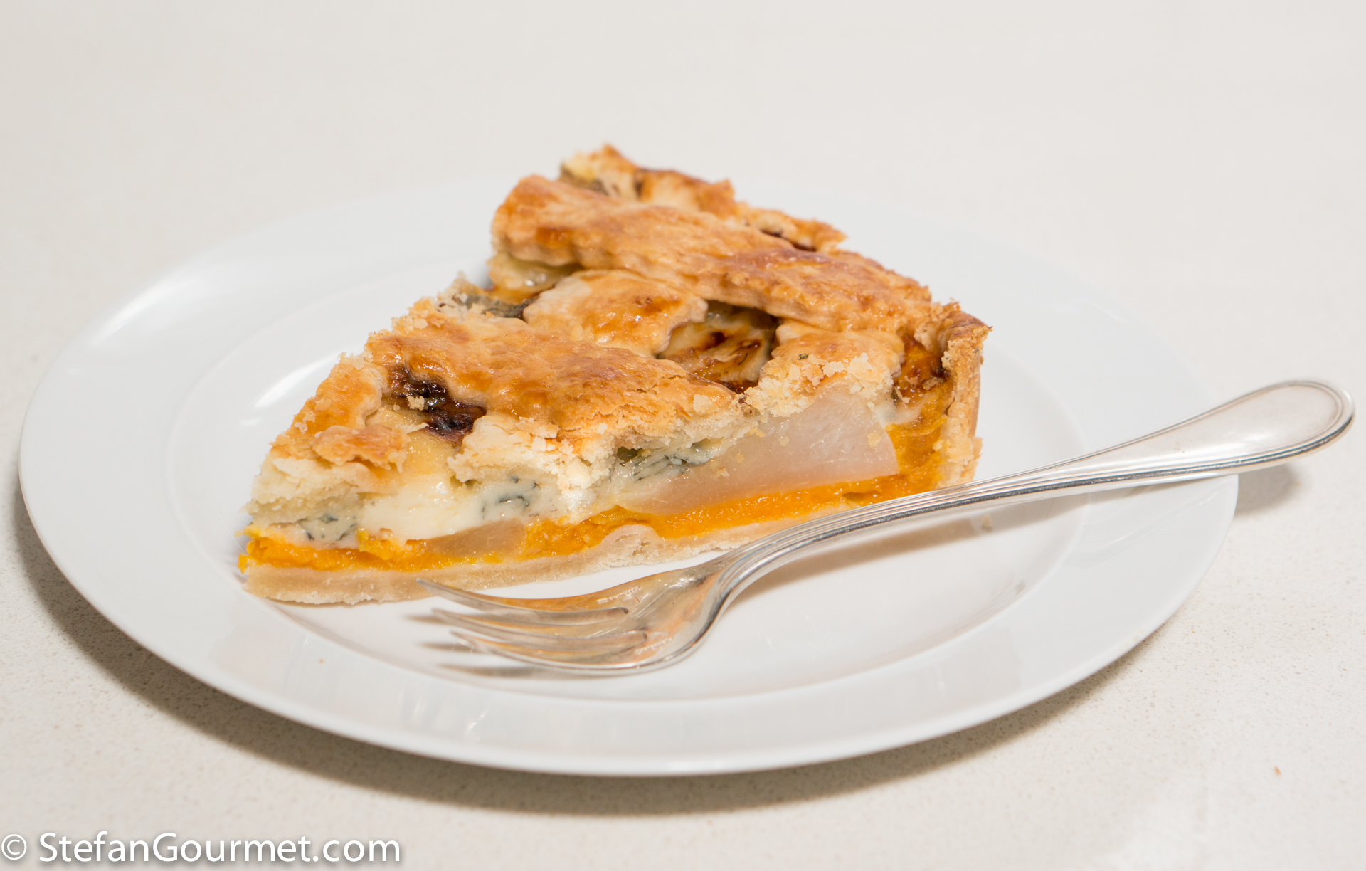 Pumpkin season has arrived. We did not have this pie during our recent trip to Italy, but the inspiration for it did come from Italy. Paola recently blogged about a pumpkin, gorgonzola, and pear tart. I have combined gorgonzola and pears before as well as gorgonzola and pumpkin, but not yet all three of them together. That really appealed to me, and I thought that it would be nice to make it with a flaky crust and serve it as a cross between a cheese course and a dessert, accompanied with a semi-sweet dessert wine.