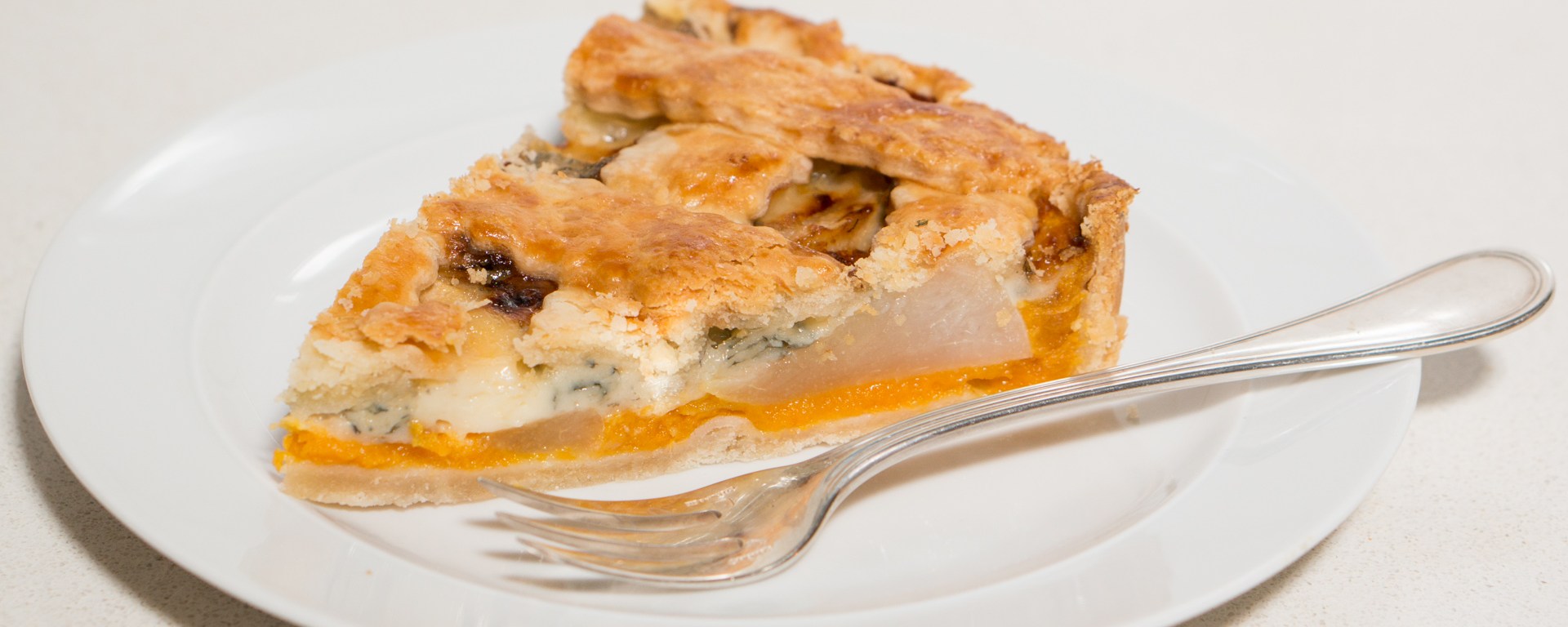There is hardly any added sugar in this recipe; all the sweetness is the natural sweetness of the pears and the pumpkin or butternut squash. I was very happy with the result, as it is not very sweet at all but it is very tasty. The flaky crust and the lattice pattern make it more festive. I could also imagine this as a lunch, served with a green salad and perhaps some off-dry sparkling wine…