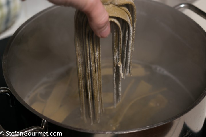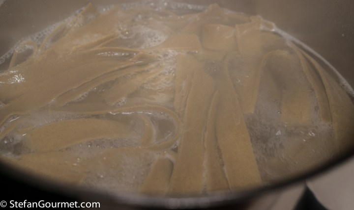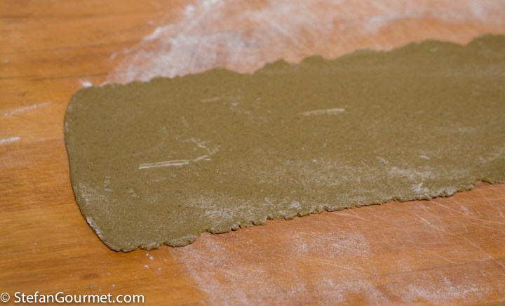 Meanwhile, roll out the pasta dough. I used the pasta machine to a setting of “6” (with “9” the thinnest setting). Rolling out this dough is not as easy as with regular pasta dough, but it is doable.