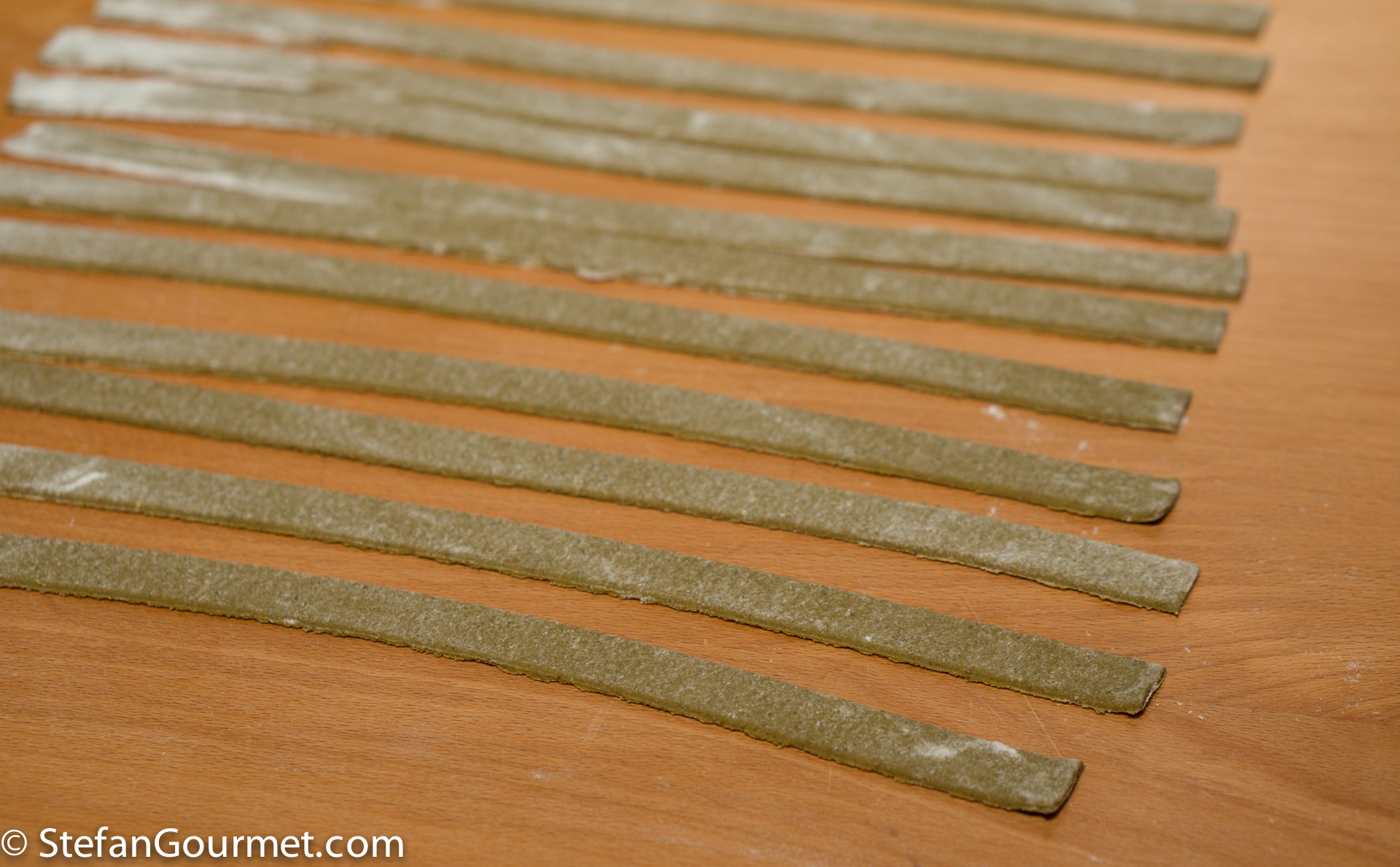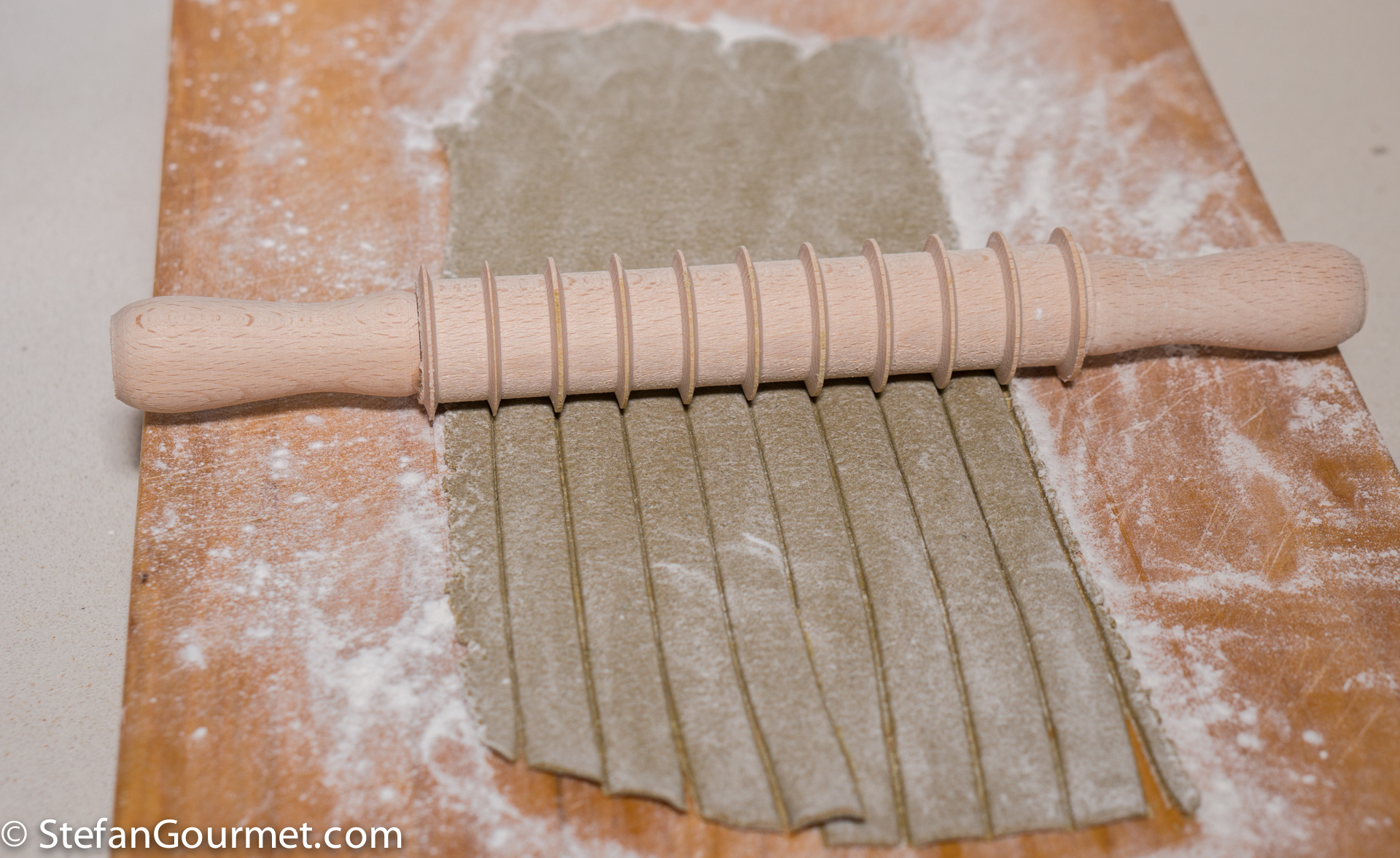 I used the new tool I had picked up in Italy to cut the pasta sheets into pappardelle of about 1 cm (1/2 inch) wide.