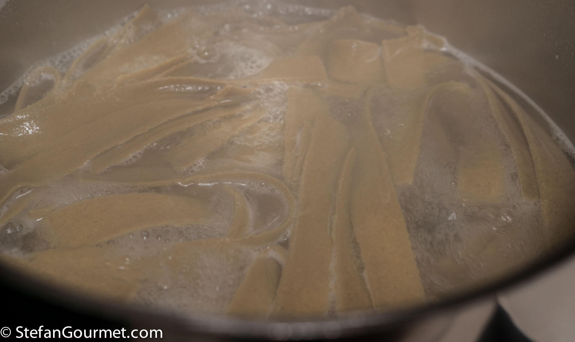 Bring a large pot of water to a boil. When the water boils, add salt and the pappardelle.