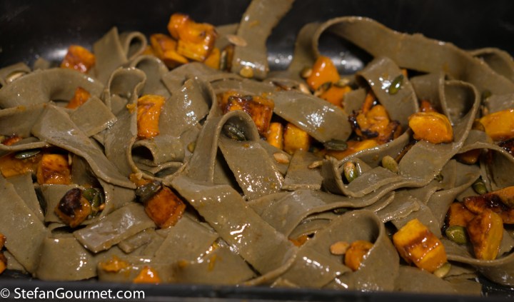 I decided to use the pumpkin seed flour to make pappardelle pasta, and to serve that pasta with roasted pumpkin and roasted pumpkin seeds, to make this a showcase of pumpkin. The result was amazingly delicious and I urge you to try this. It is difficult to make vegan dishes that are delicious and nutritious, but this dish ticks all the boxes. I really did not feel the need to add anything else (like cheese). I will definitely make this again.