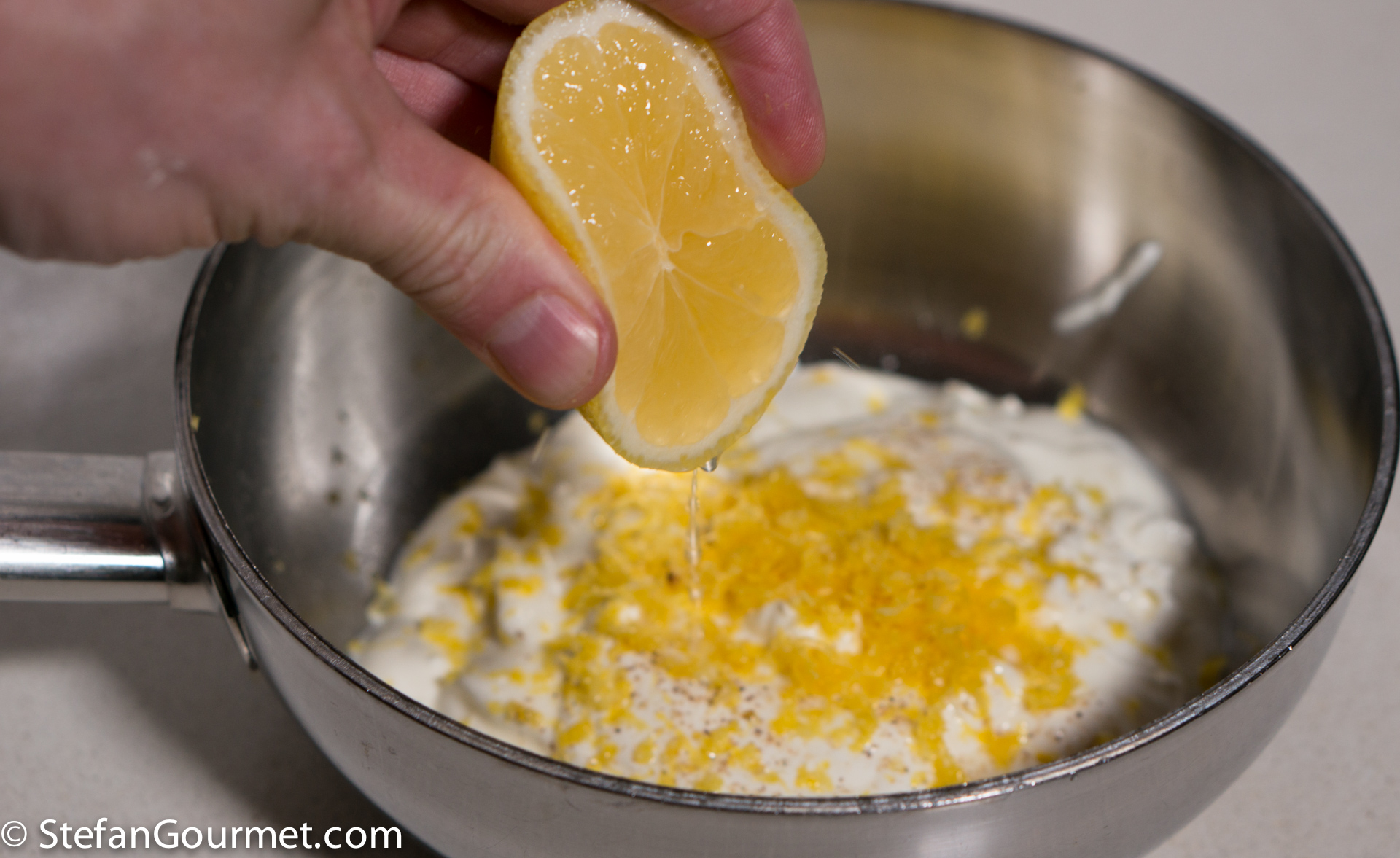 For the yogurt sauce, put the yogurt in a saucepan and add the grated lemon zest…