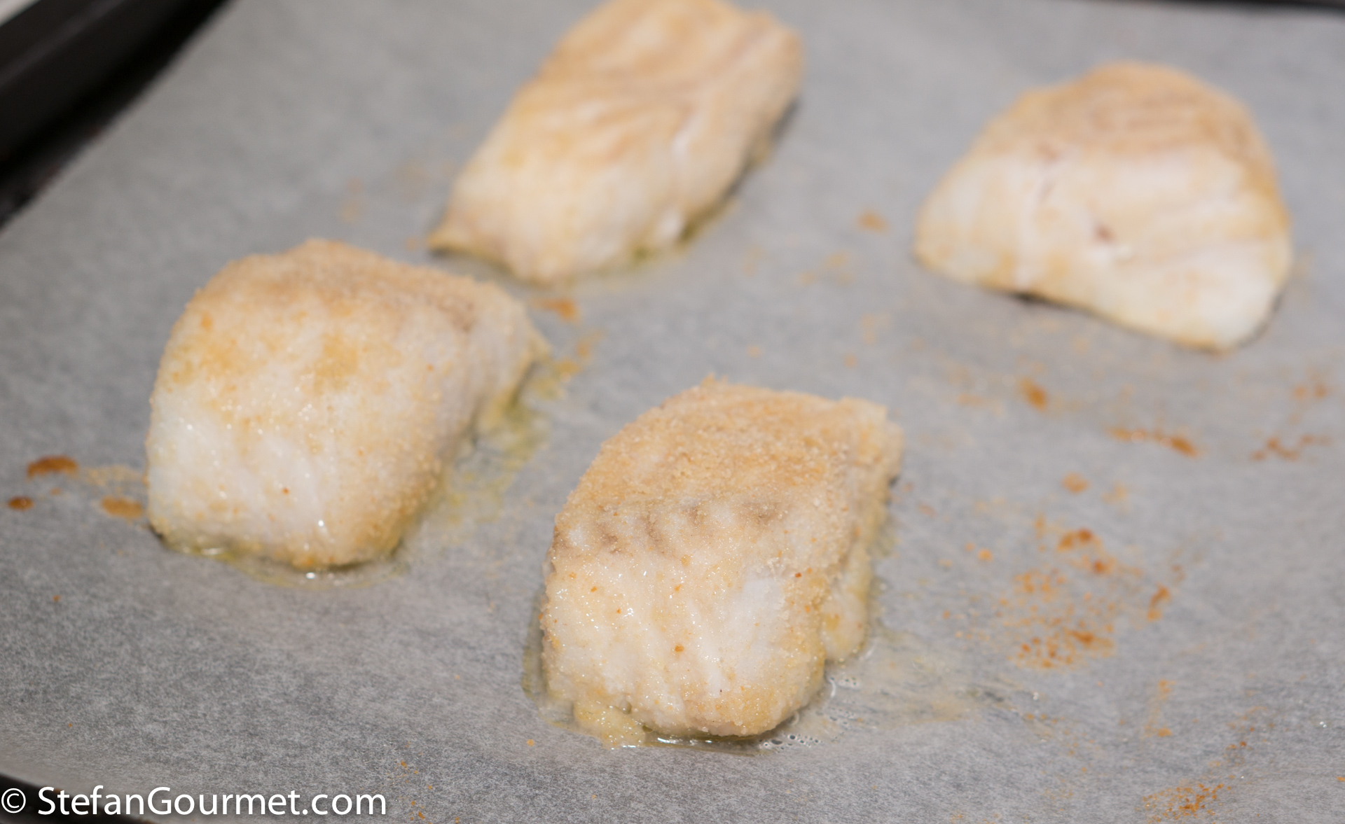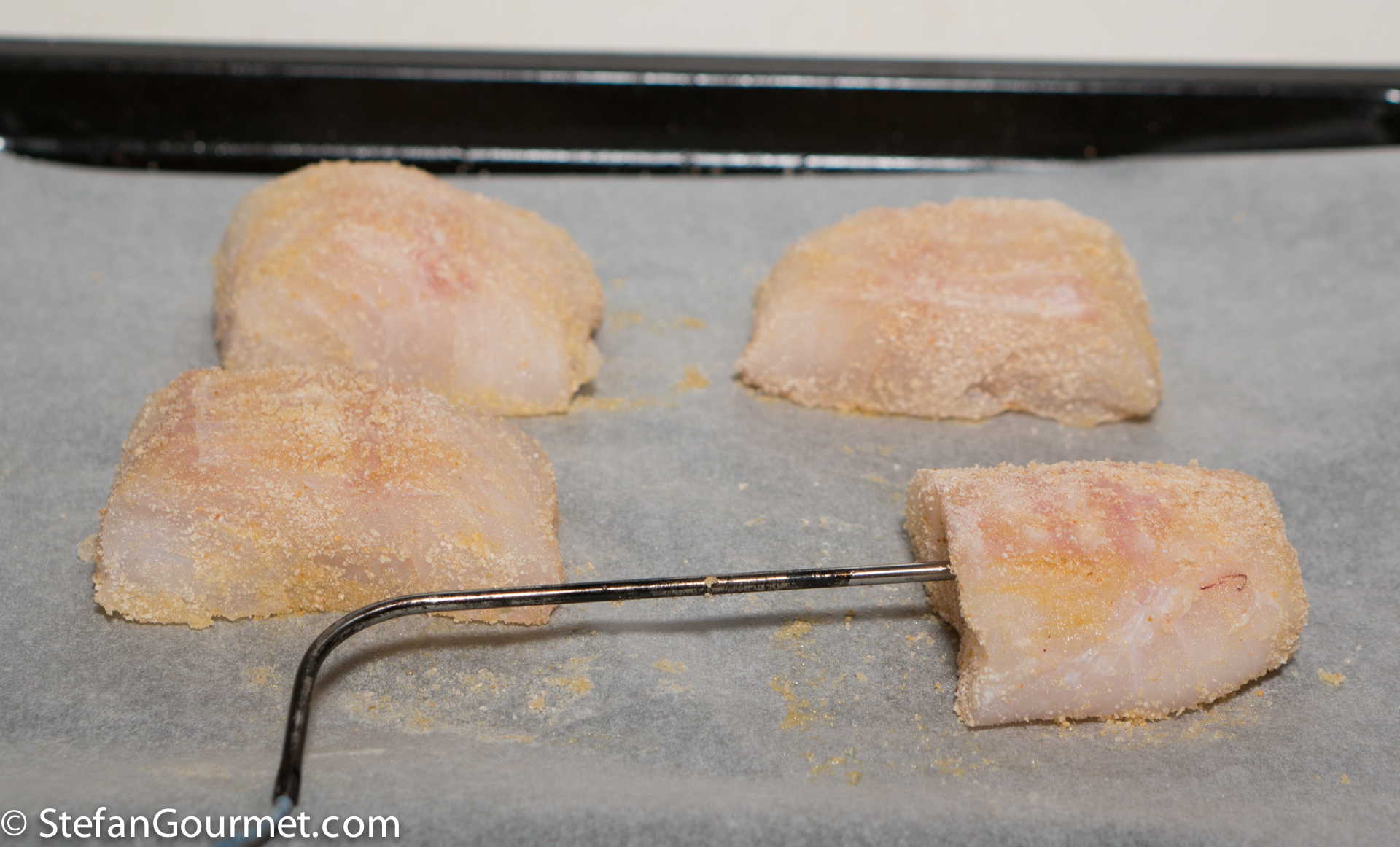 …and cook the fish in the oven at 180C/350F until the core temperature is 50C/122F.