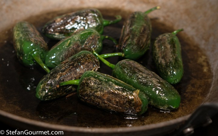 Cook the green peppers over high heat in a bit of oil until blistered all over, then turn off the heat and season with salt.