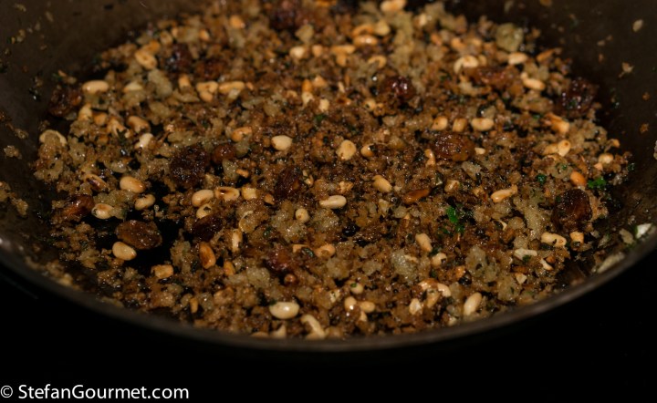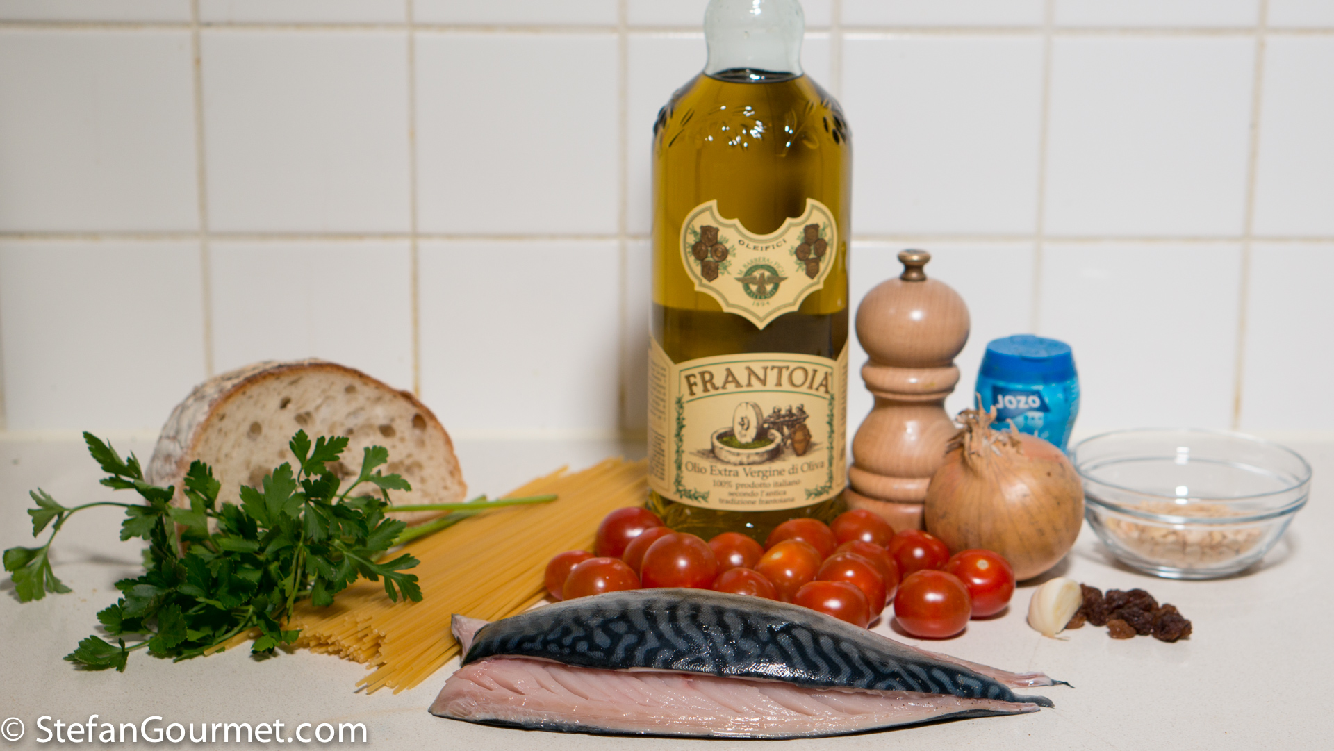 Bea has Sicilian roots and that clearly shows in the recipe for Vermicelli alle Alici con pangrattato dorato that she posted recently. Since fresh anchovies are not so easy to find around here and it is a lot of work to clean them, I decided to make a similar dish using mackerel. Many pasta dishes from the south of Italy use breadcrumbs from stale bread that are fried in olive oil. What makes this dish Sicilian is the addition of raisins and pine nuts. The combination of textures and flavors in this dish is sublime. Succulent mackerel, “al dente” spaghetti, crunchy breadcrumbs, velvety onions, and juicy cherry tomatoes. If you want to stay closer to Bea’s original, by all means use fresh anchovies instead of mackerel. Here’s what I did…