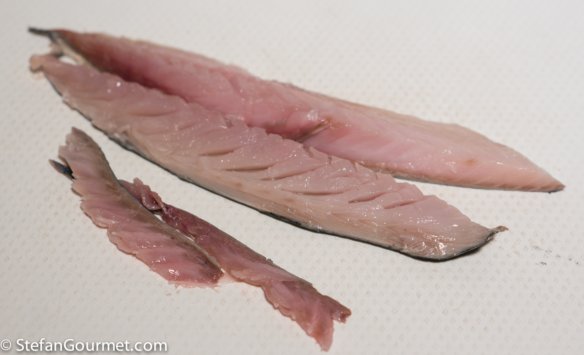 Bring a large pot of water to a boil for the pasta. In the meantime, cut away and discard the central part of each mackerel fillet that has bones in it.