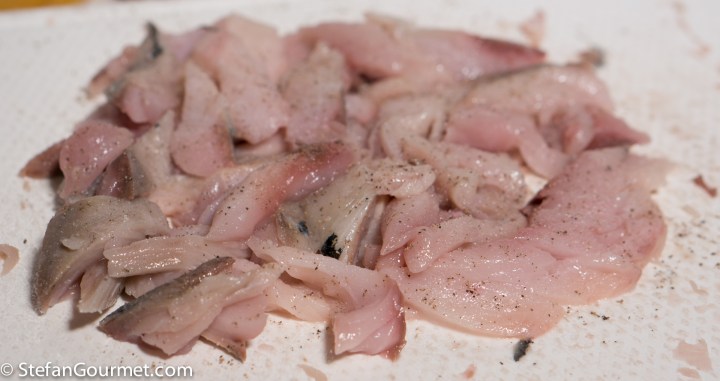 Roughly chop the mackerel, and season with salt and freshly ground black pepper. Seasoning the mackerel before cooking it, allows it to absorb some of the salt so it will have more taste.