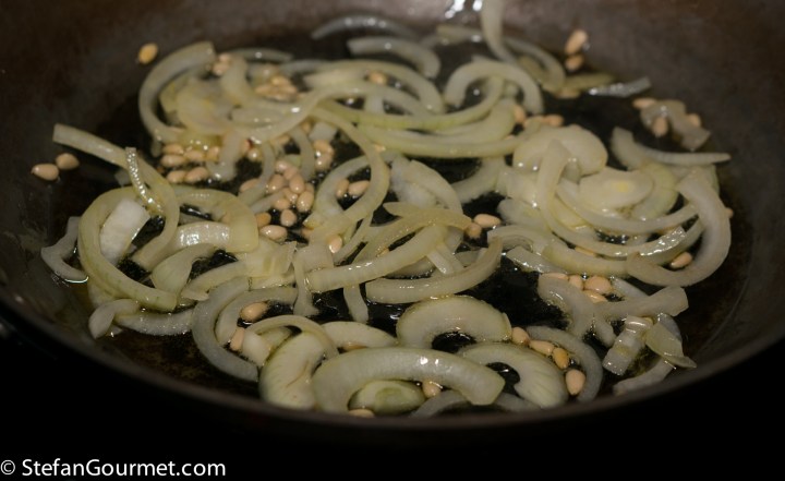 Put the onion in a frying pan with 1 tablespoon of the pine nuts and 2 tablespoons of olive oil over medium heat.