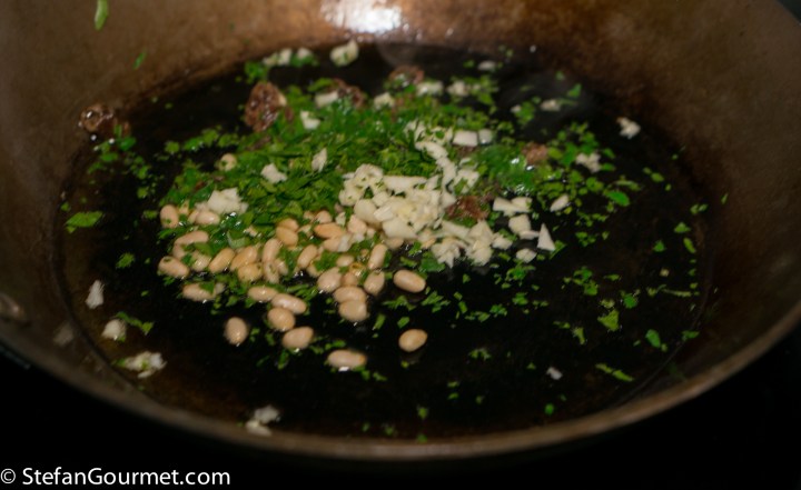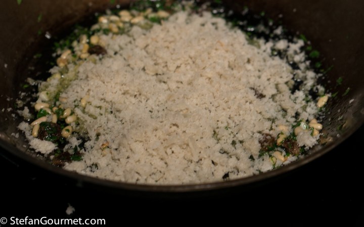 In the meantime in a separate frying pan, add 2 tablespoons of olive oil, the parsley, the other tablespoon of pine nuts, the minced garlic, and the raisins.