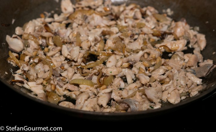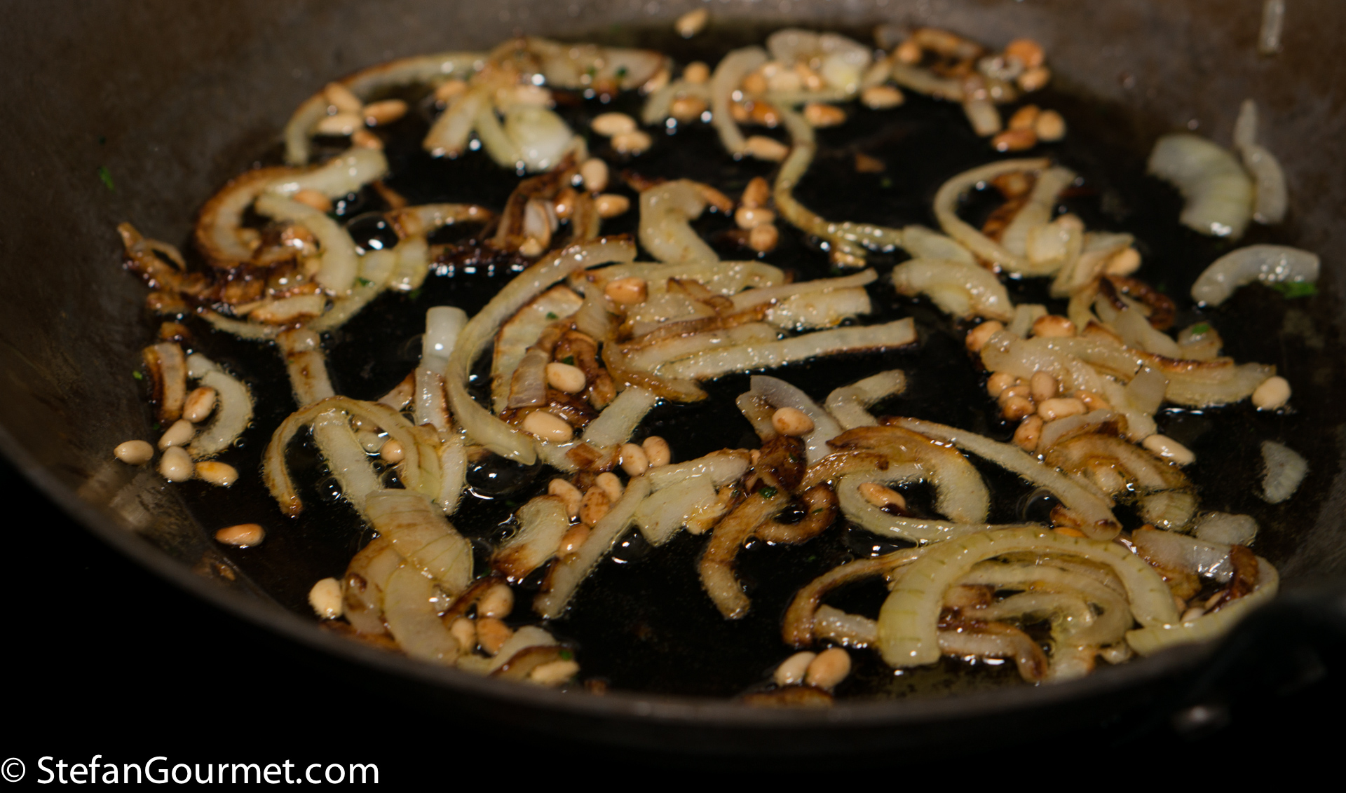Cook this, stirring regularly, until the onions are soft and the pine nuts are golden.