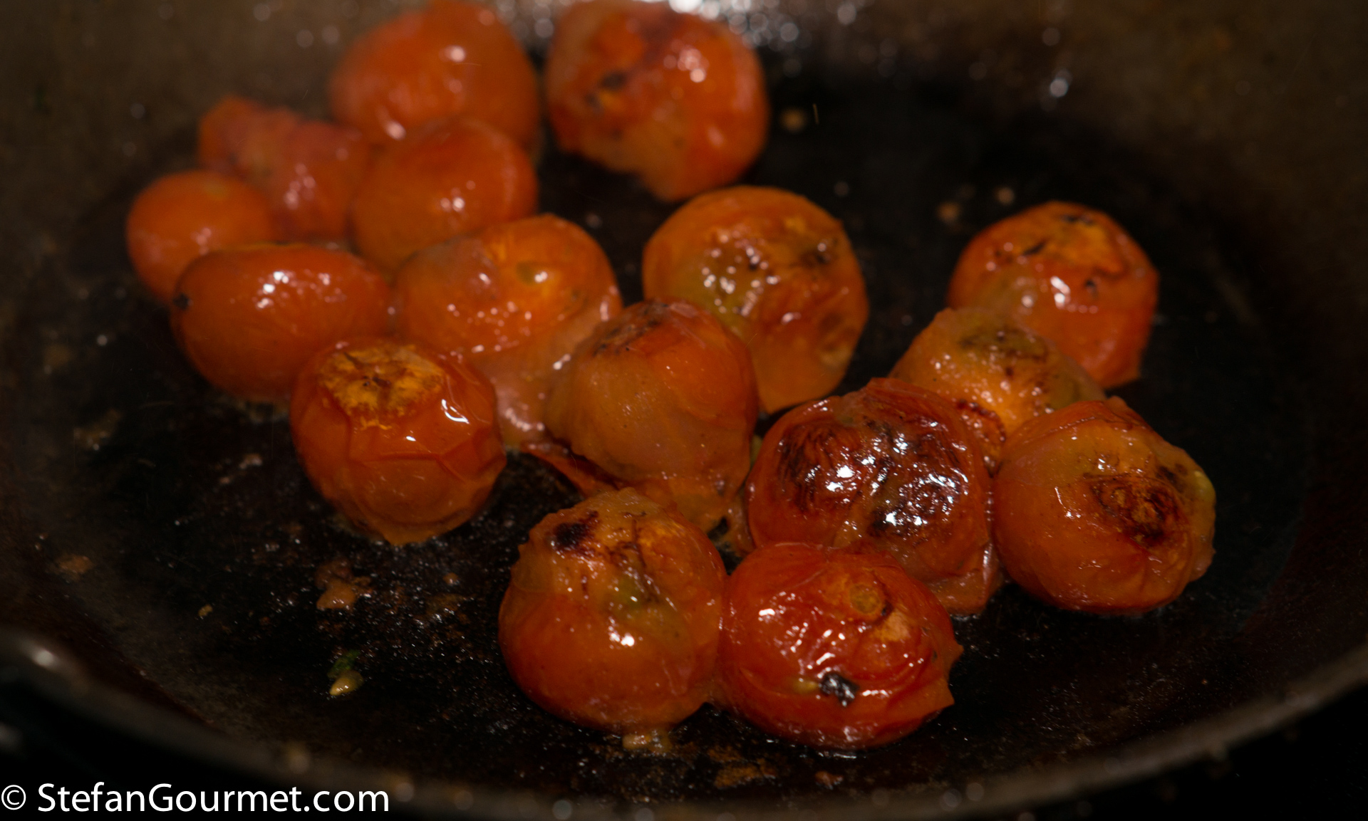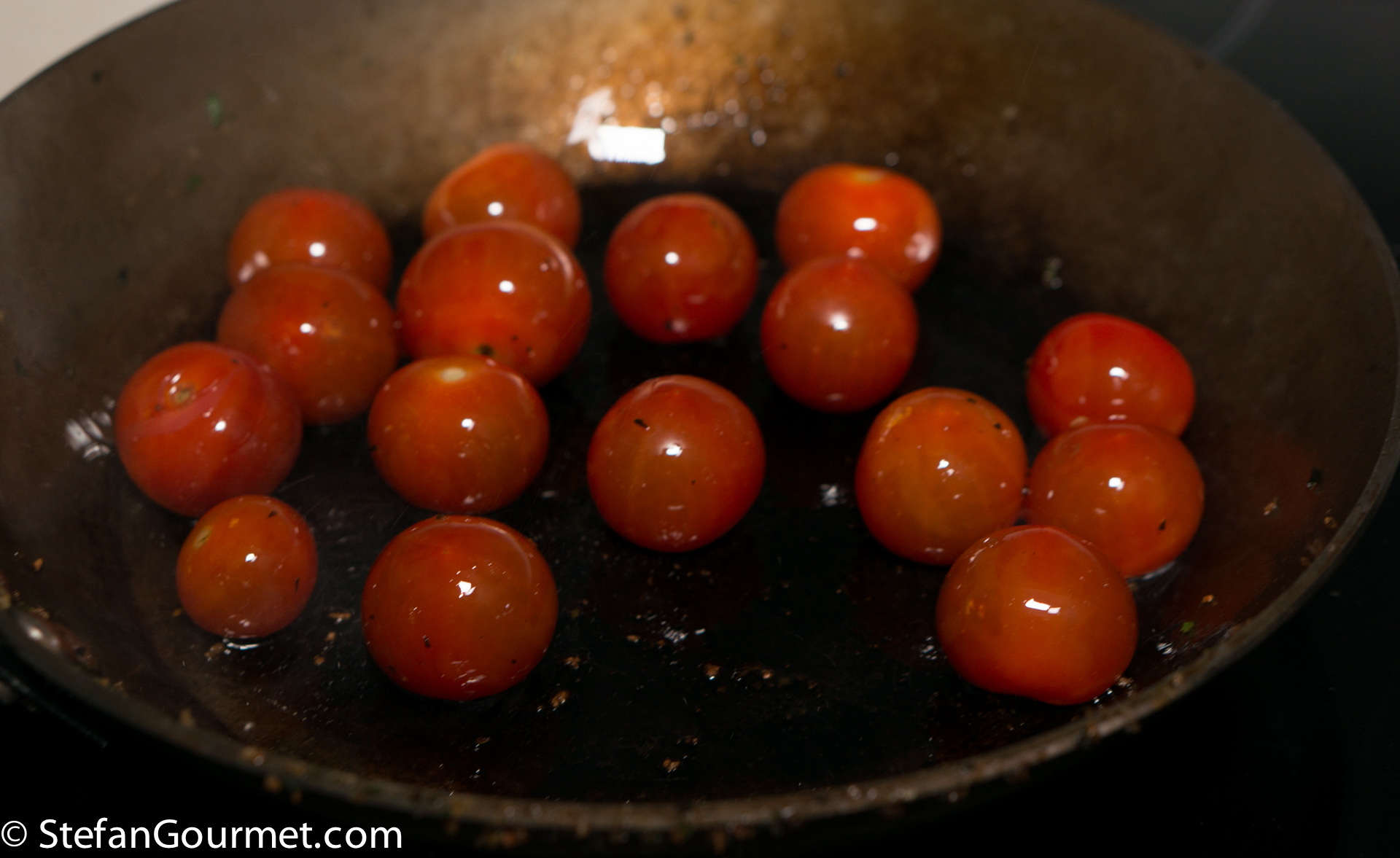 Clean the frying pan with some kitchen paper and add a tablespoon of olive oil and the cherry tomatoes.
