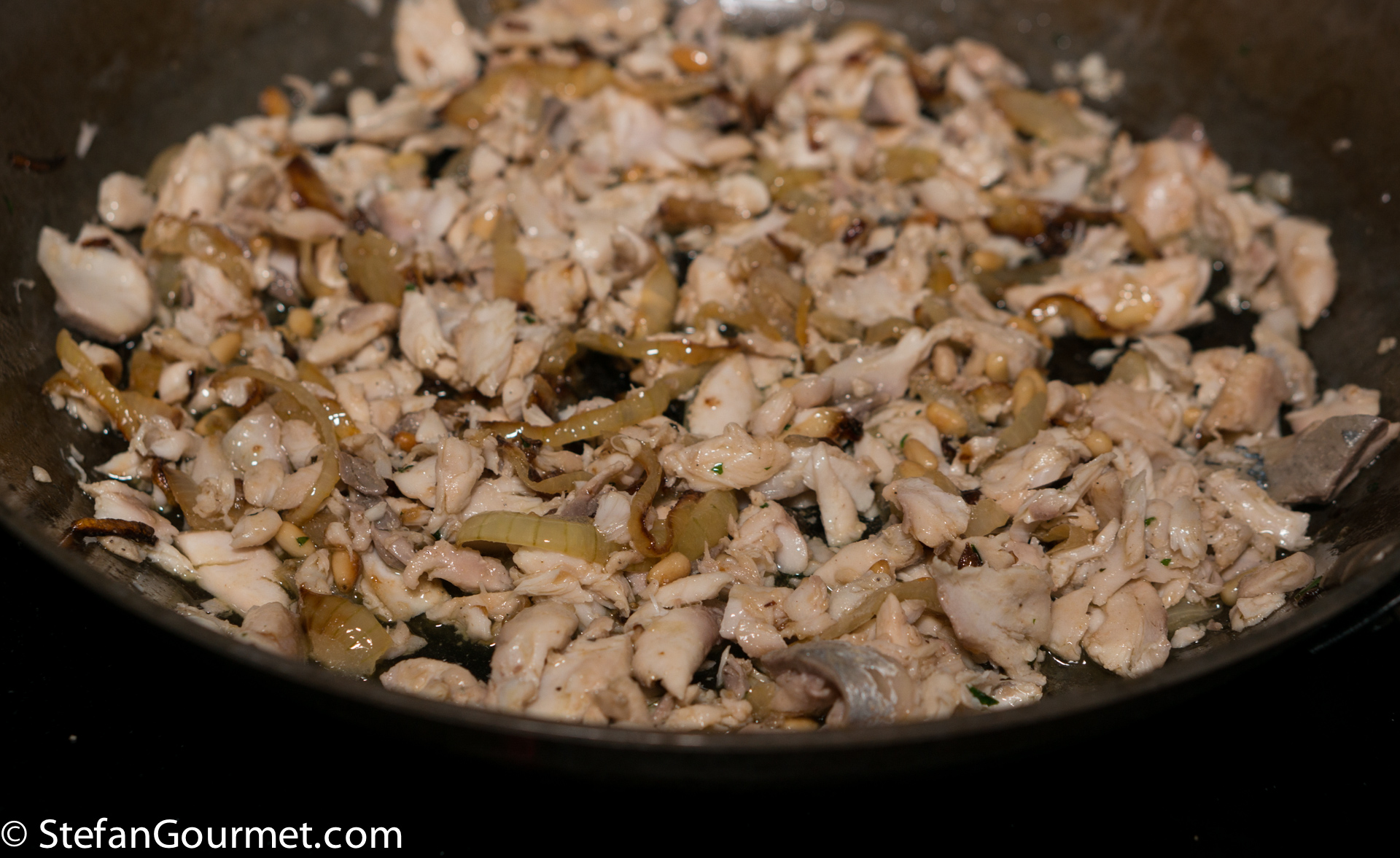 When the onions are soft and golden, add the mackerel and turn off the heat.