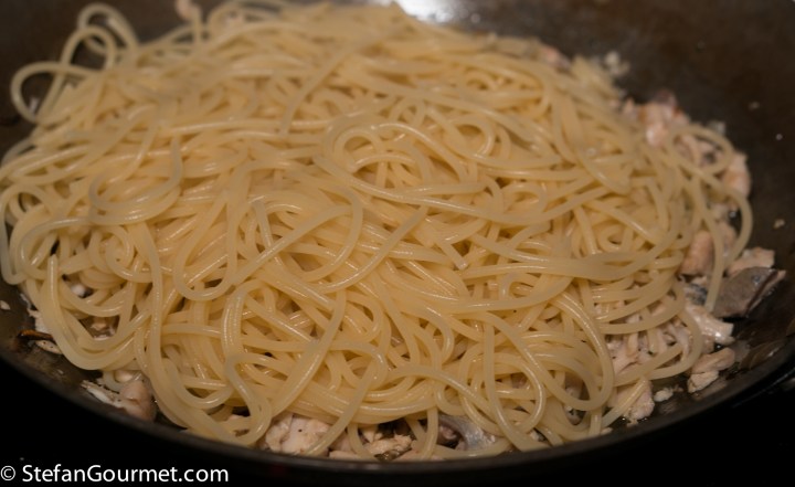 When the water for the pasta boils, add salt and the spaghetti. Cook for the time indicated on the package for al dente.