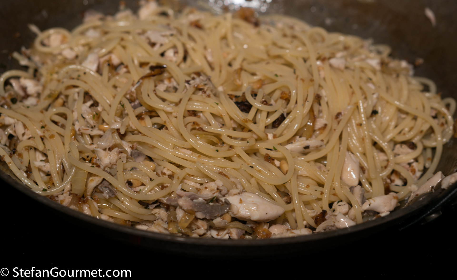 When the spaghetti is al dente, drain it, reserving some of the cooking water, and add the spaghetti to the onions and mackerel.