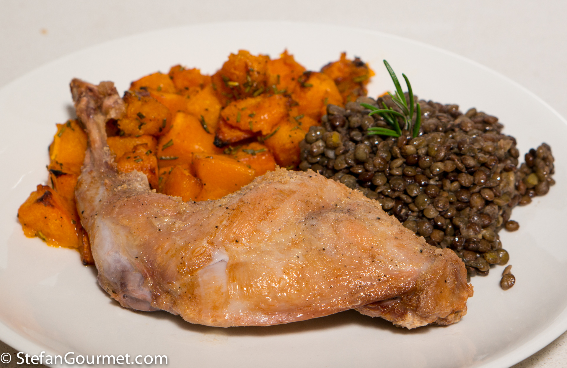 Rabbit leg that is crispy on the outside but juicy and tender on the inside, with roasted pumpkin and lentils is a seasonal and tasty dish.
