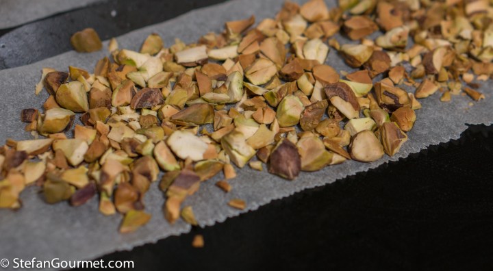 Roughly chop the pistachios, and toast them in the oven at 180C/350F until golden, about 8 minutes.