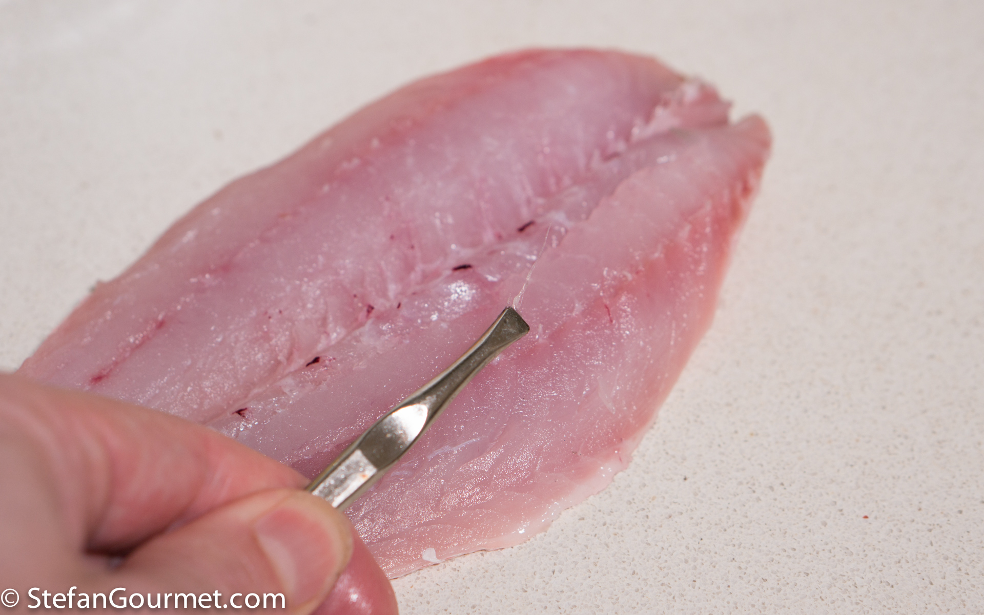 Remove any bones that are left in the mullets using tweezers, feeling with your fingertips to find them.