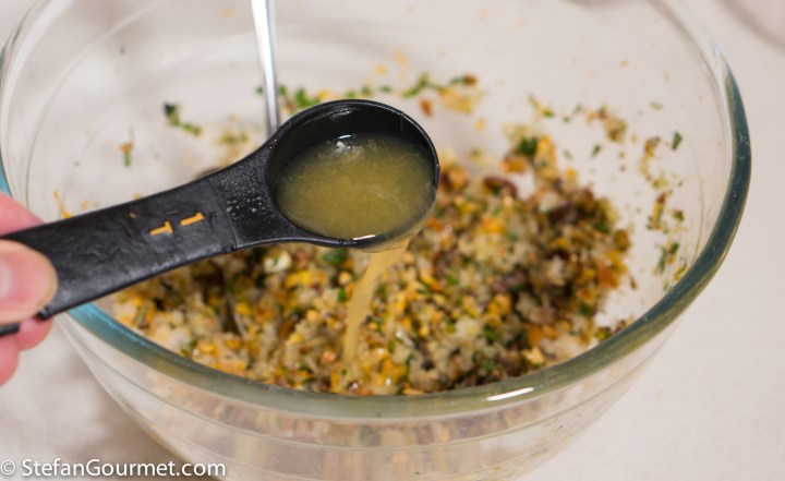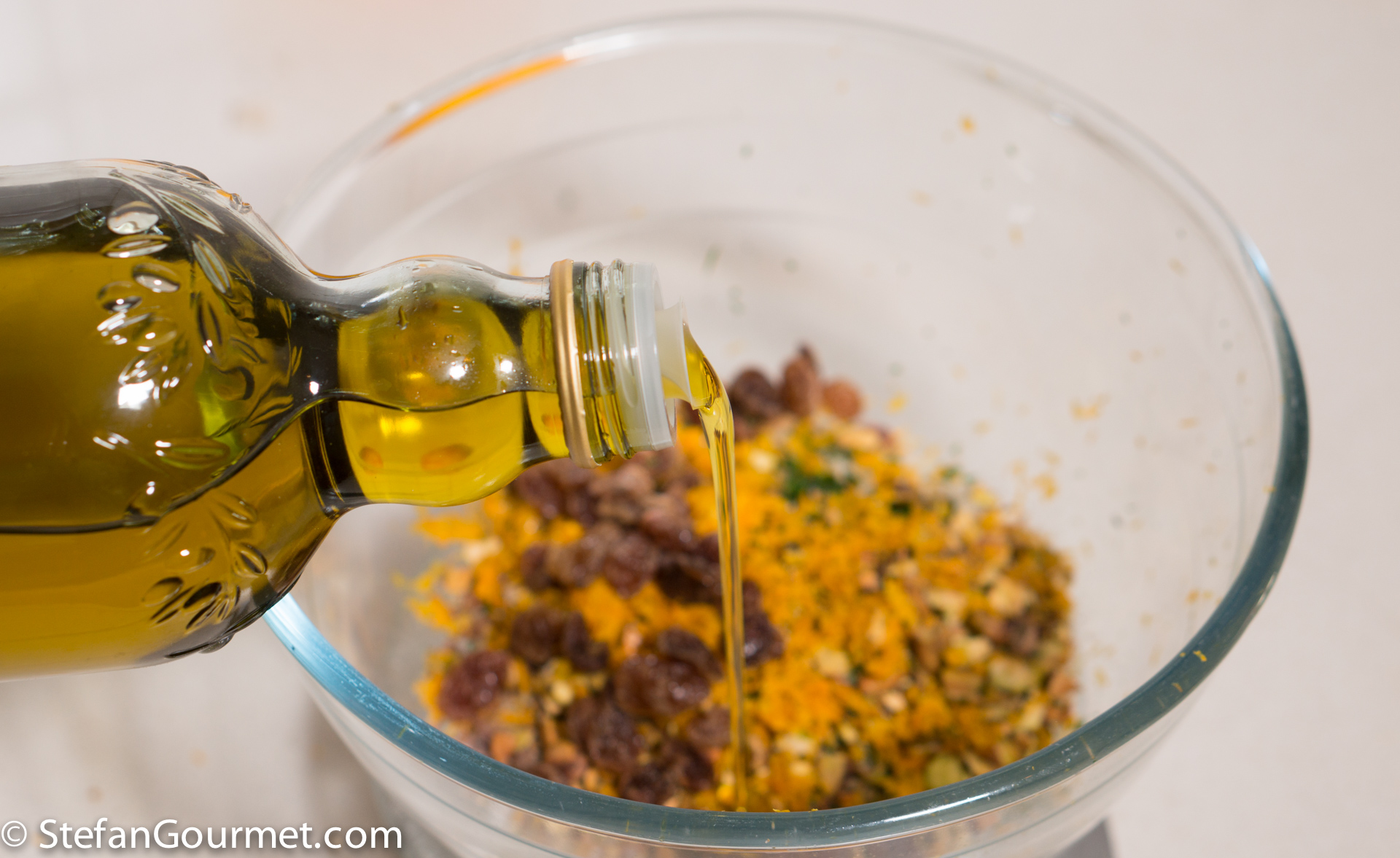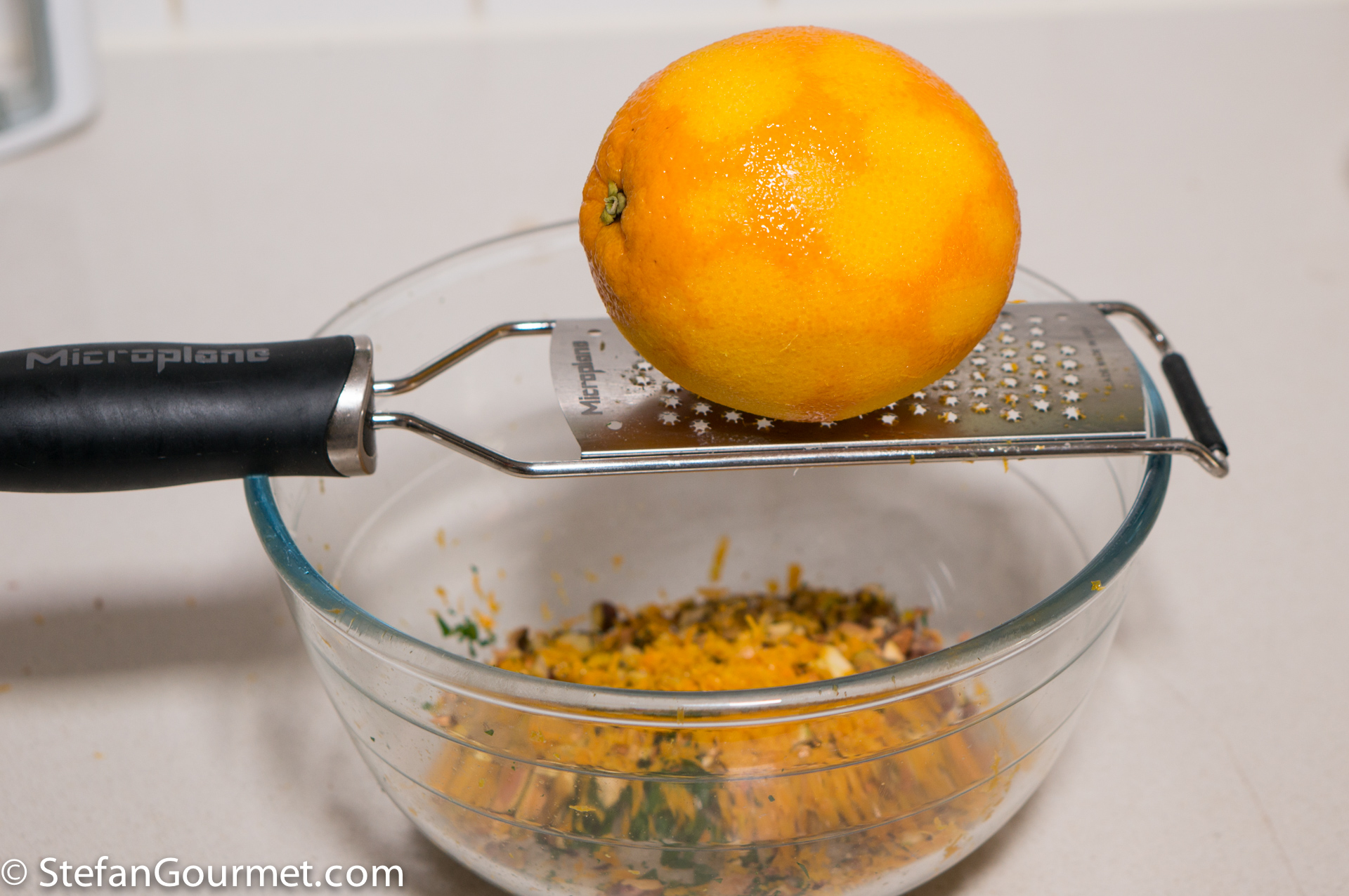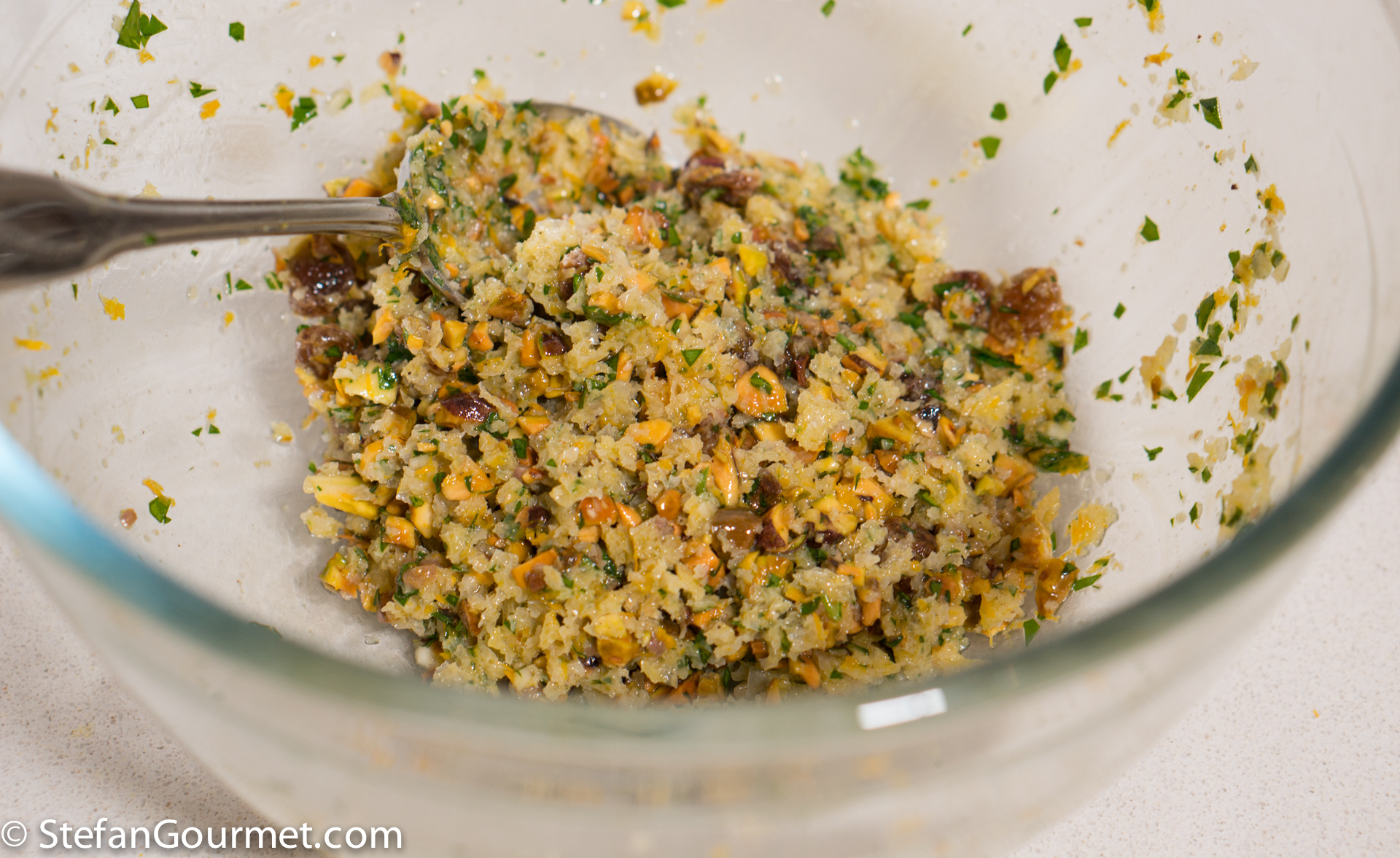 Combine the breadcrumbs, parsley, raisins, pistachios, and grated orange zest in a bowl. Season with salt and freshly ground black pepper.