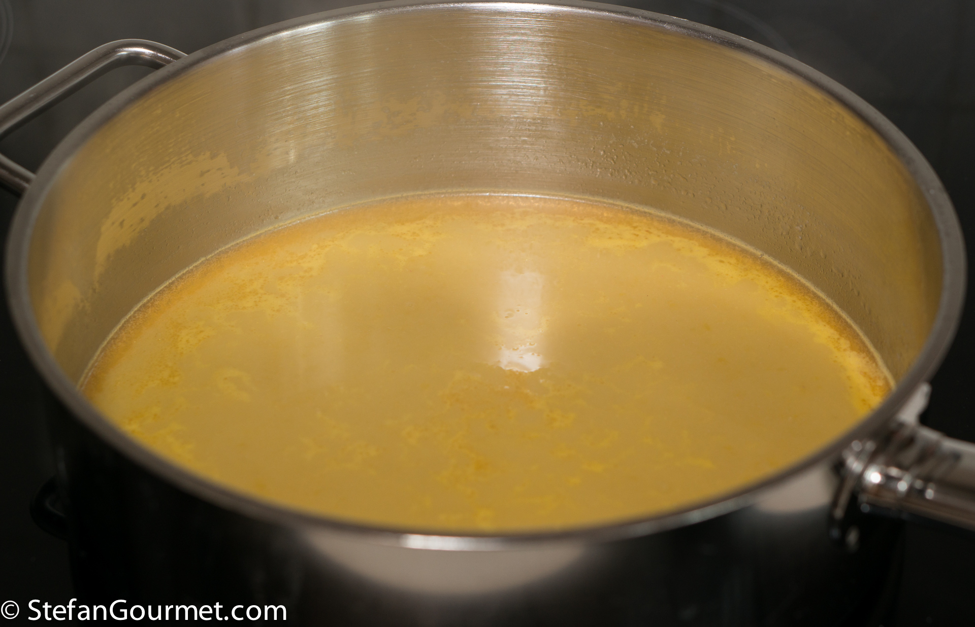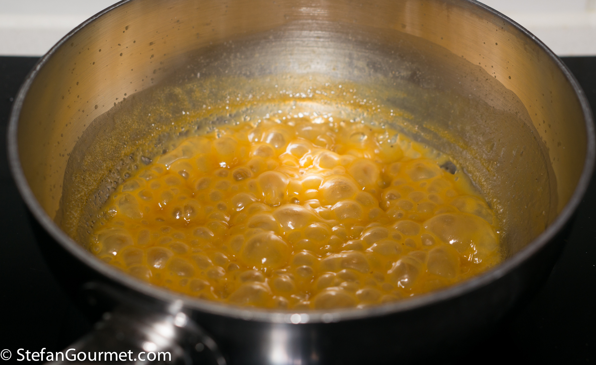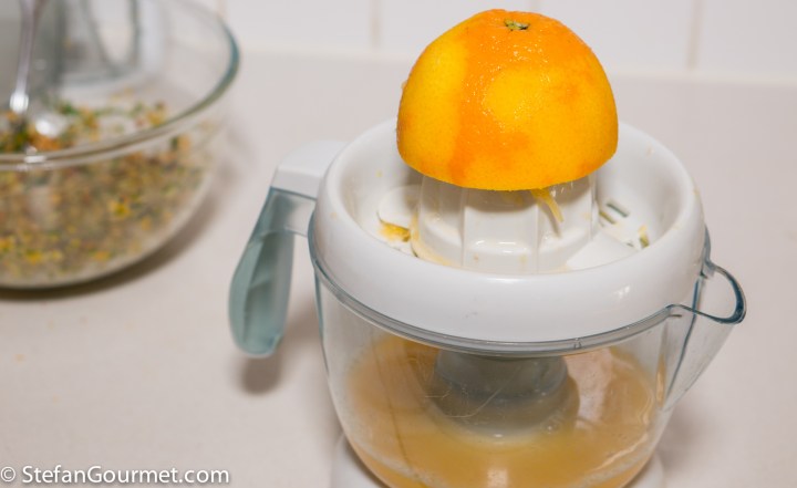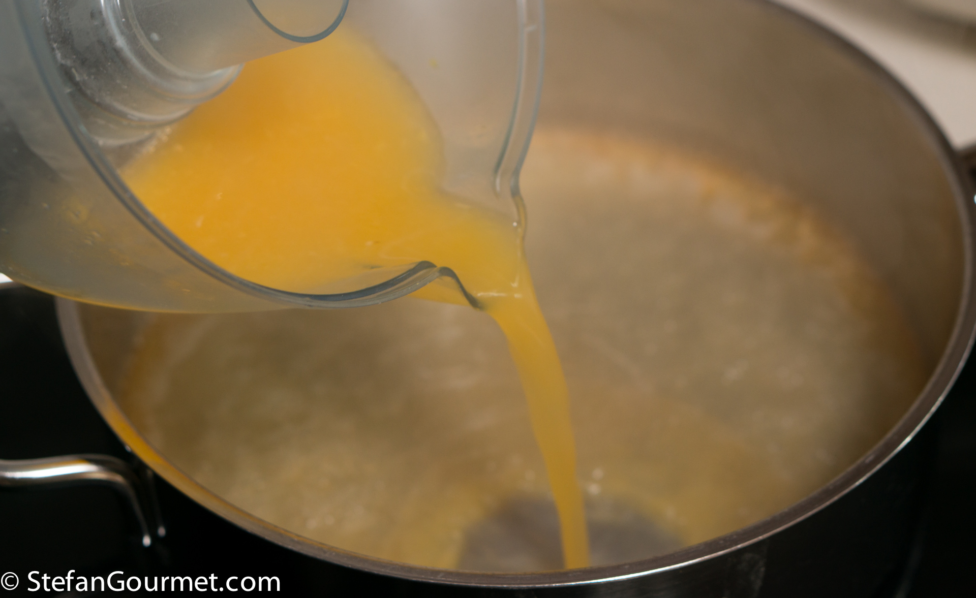 …until the sauce is thick. Season with salt and freshly ground black pepper to taste. You may have to add a pinch of sugar if the orange wasn’t sweet enough.
