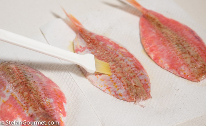For the presentation ask your fishmonger to butterfly the mullets. This means filleting the mullets in such a way that the two fillets remain attached to each other. The tail is left on as well.