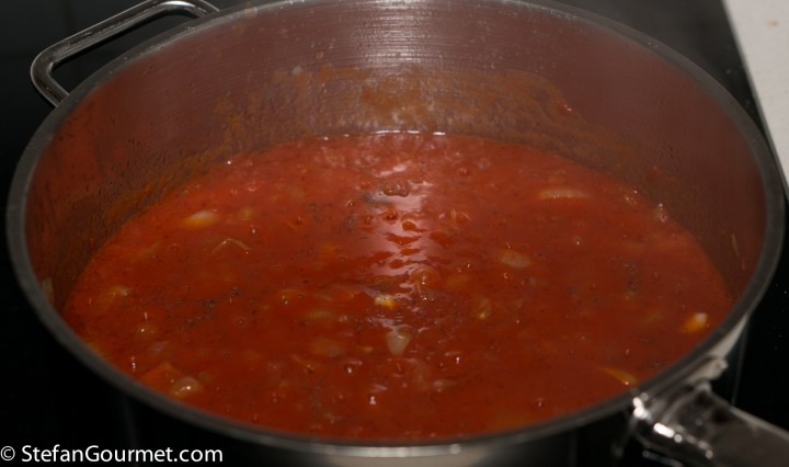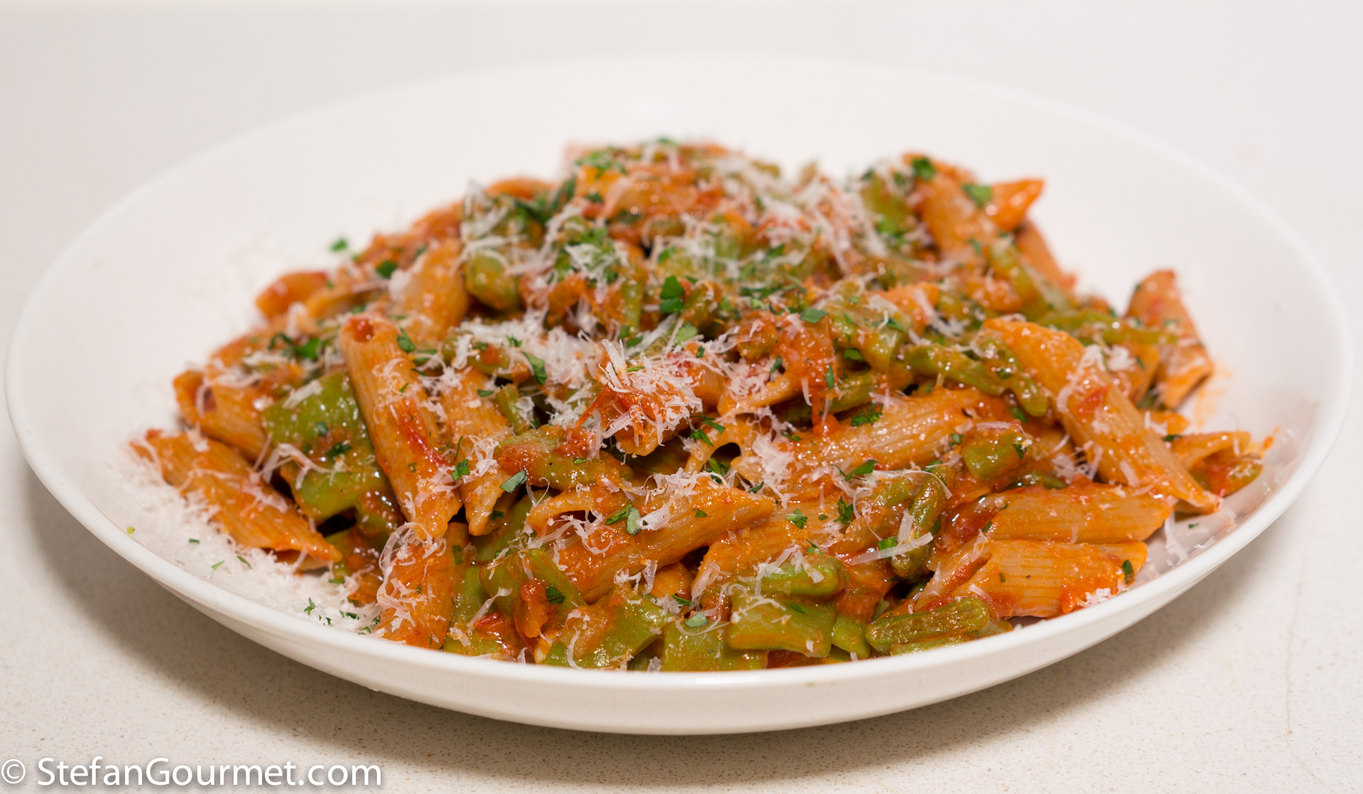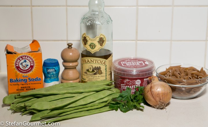 The dish itself is very tasty with just the right balance between flavors and textures. Not using too much tomato is important for that balance. I really like the name of runner beans in Italian: piattoni (big flat ones). When you don’t cook them long enough, they can squeak when you eat them (which is kind of unpleasant). To make sure that the beans are cooked in the same time as the pasta, I add a bit of baking soda to the cooking water. This will make the water alkaline (increase the pH), which speeds up the cooking process. The tomato sauce is prepared separately. If you were to cook the runner beans in the (acidic, low pH) tomato sauce, it would take a lot longer to cook the runner beans.