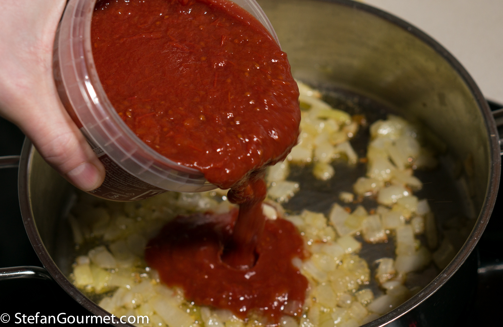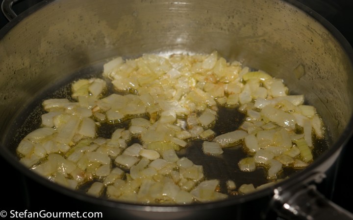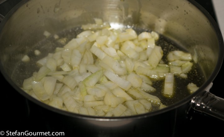7:19pm Heat 2 tablespoons of olive oil in a frying pan, add the chopped onion, and season with salt. Cook the onion over medium heat, stirring regularly.