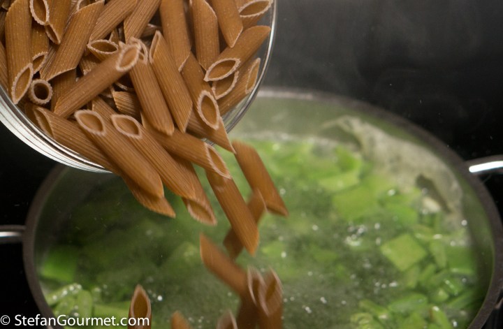 7:25pm Add the pasta, and set the timer for al dente according to package instructions. In my case this was 11 minutes.