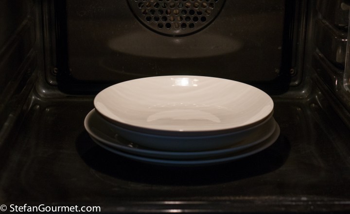 7:15pm Put the plates in the oven at 100C/220F to preheat them.
