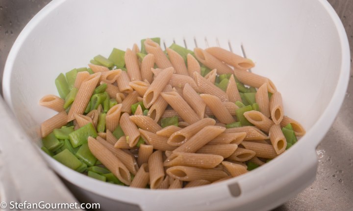 7:36pm When the timer beeps, drain the pasta and runner beans using a colander.