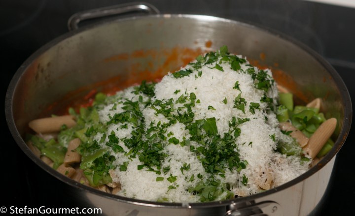 7:38pm Add most of the parmigiano and most of the parsley as well.