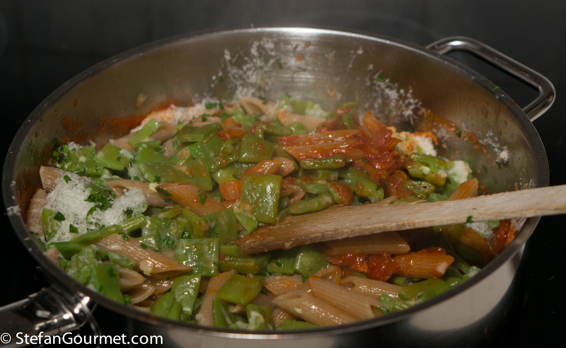 7:38pm Add the pasta and runner beans to the tomato sauce.