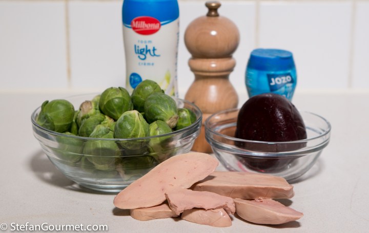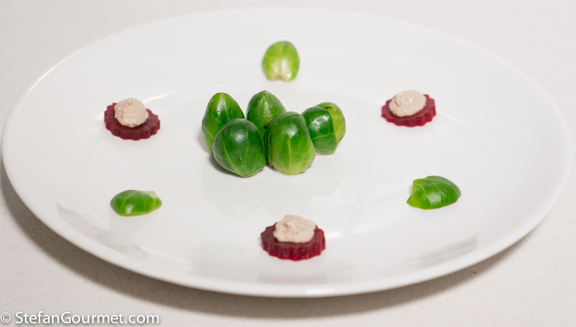 Since I had more foie gras than I needed to prepare Tournedos Rossini, I decided to use the leftover foie gras to make a simple appetizer of faux Brussels sprouts filled with cream of foie gras, inspired by a more elaborate dish we recently had at Librije. The five sprouts you see in the center of the plate look like they are actual Brussels sprouts, but they are actually only the outer leaves and the rest is cream of foie gras. I completed the dish with some beetroot, topped with more cream of foie gras. Filling the sprouts is a bit finicky, but with some help and a piping bag it is not that difficult. Given the richness of foie gras the suggested portion size is quite small.