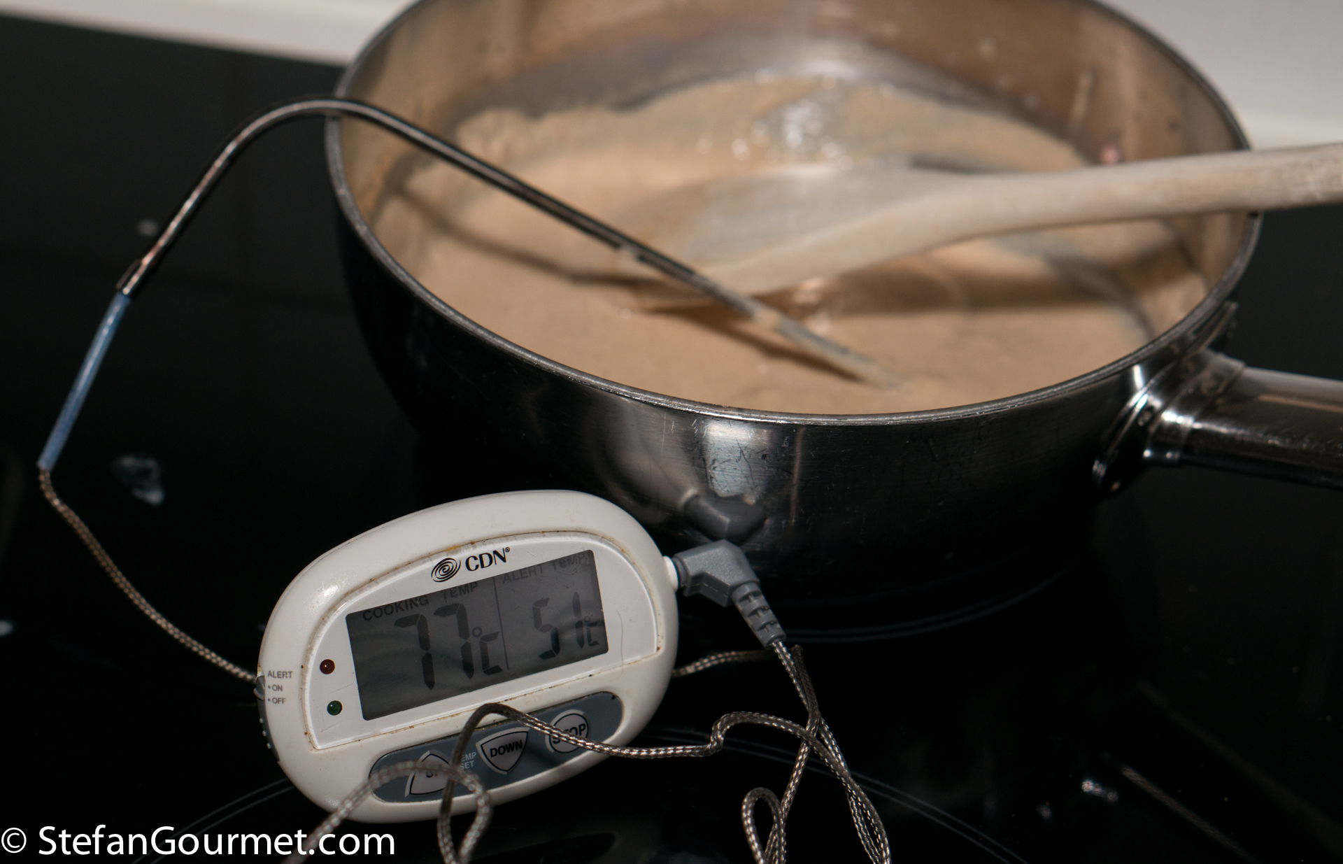 1. Just a couple of minutes. If you stir well, have good heat-distribution in your saucepan, and watch the thermometer well, you can use medium-high heat. As you can see on the photo you have to react quickly to the thermometer, as mine was already 77C instead of the intended 70C.