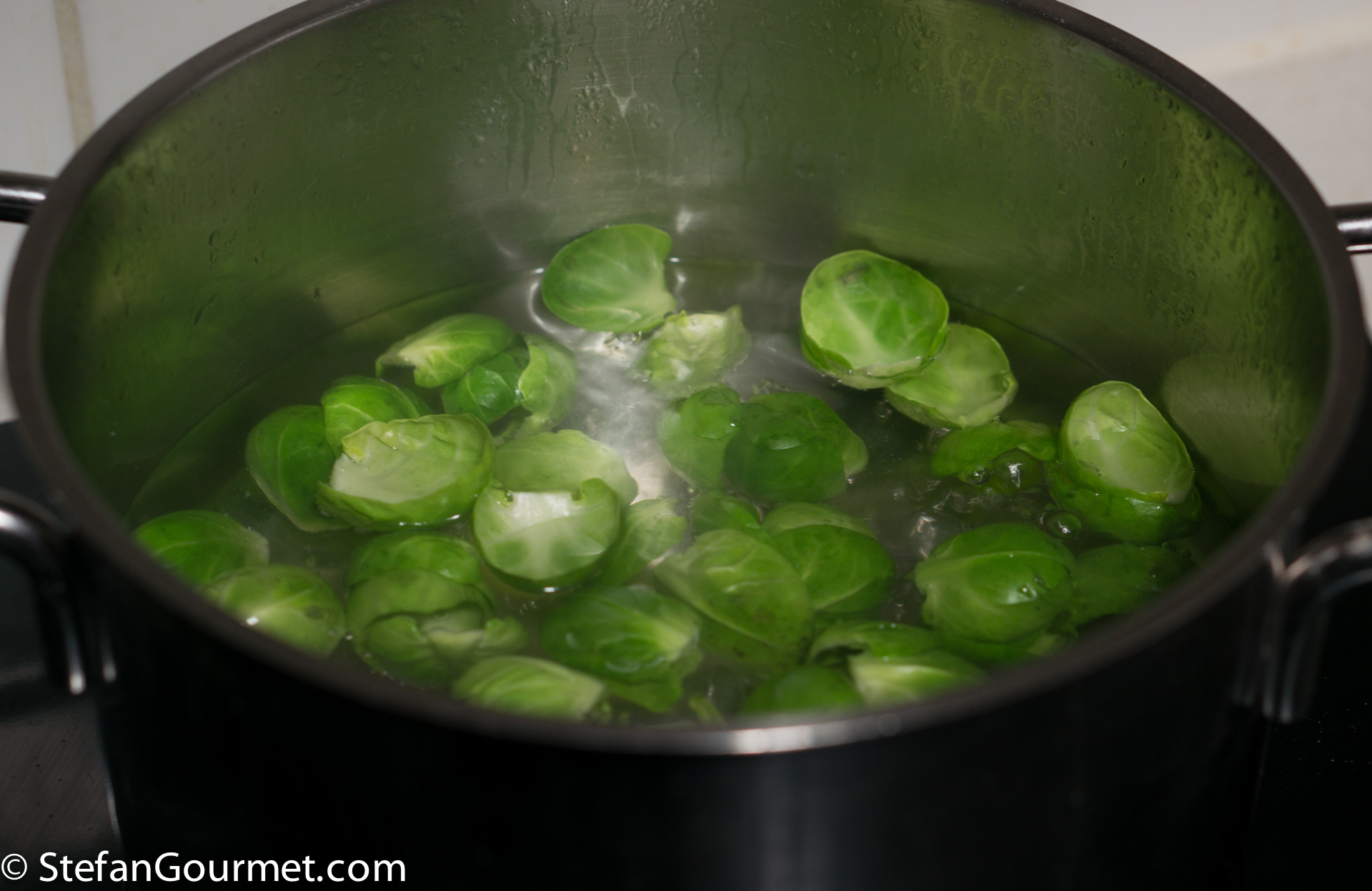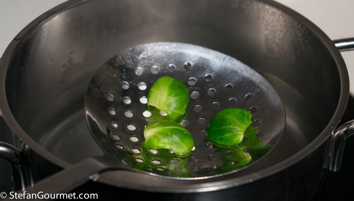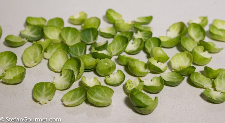 Pluck the outer leaves of the sprouts and reserve the inner sprouts for some other use.