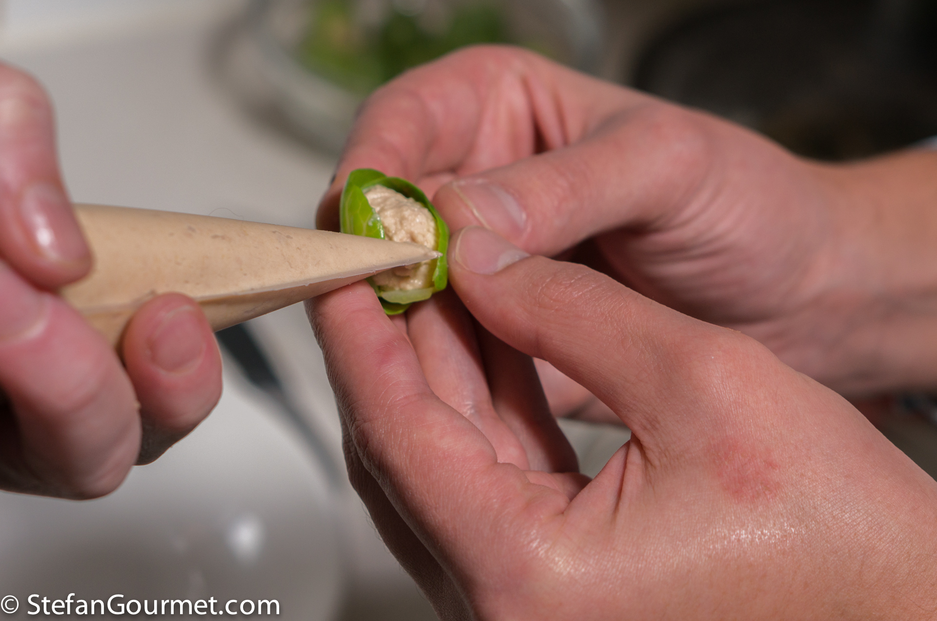 Have someone assist you. One person forms a ‘sprout’ out of three outer leaves, and holds it while the other person fills it up with the cream of foie gras.