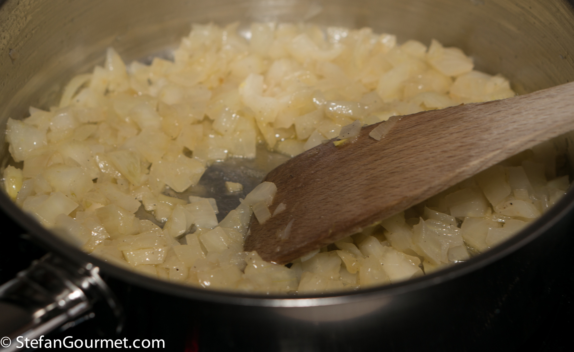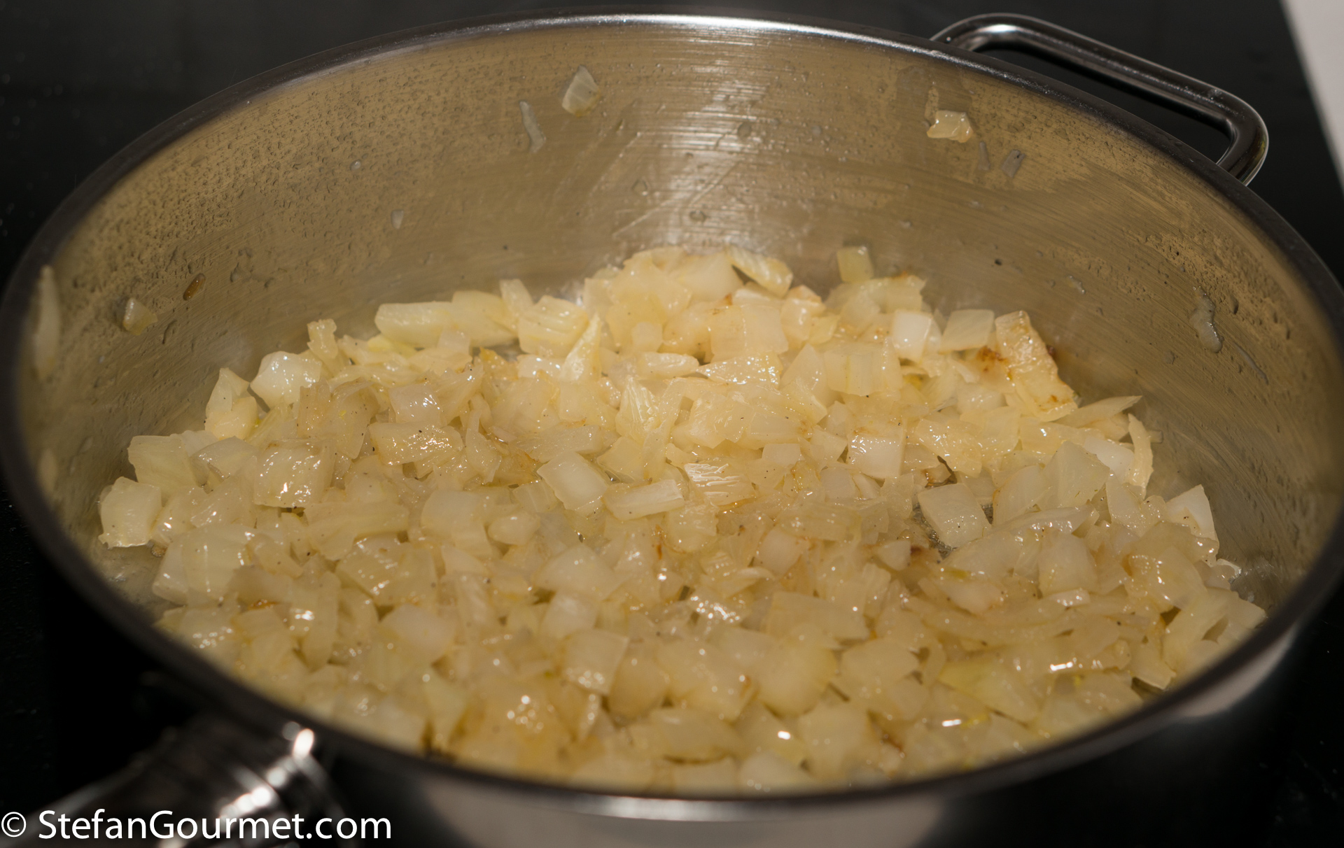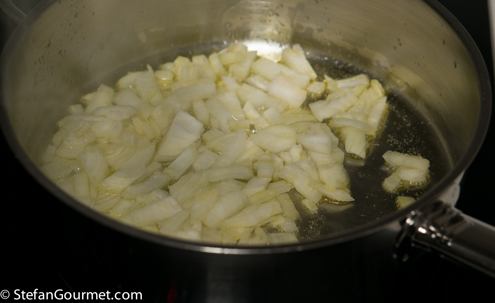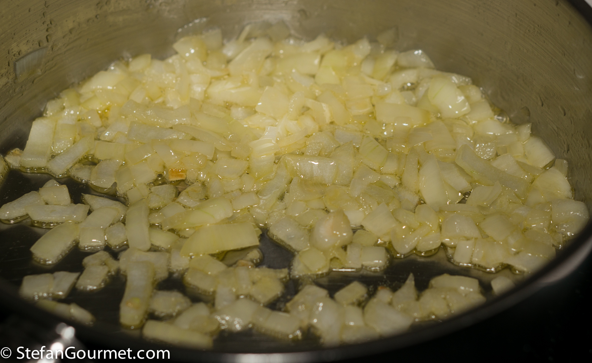Clean and chop the onion. Heat 2 tablespoons of olive oil in a frying pan. Add the onion and season with a bit of salt.
