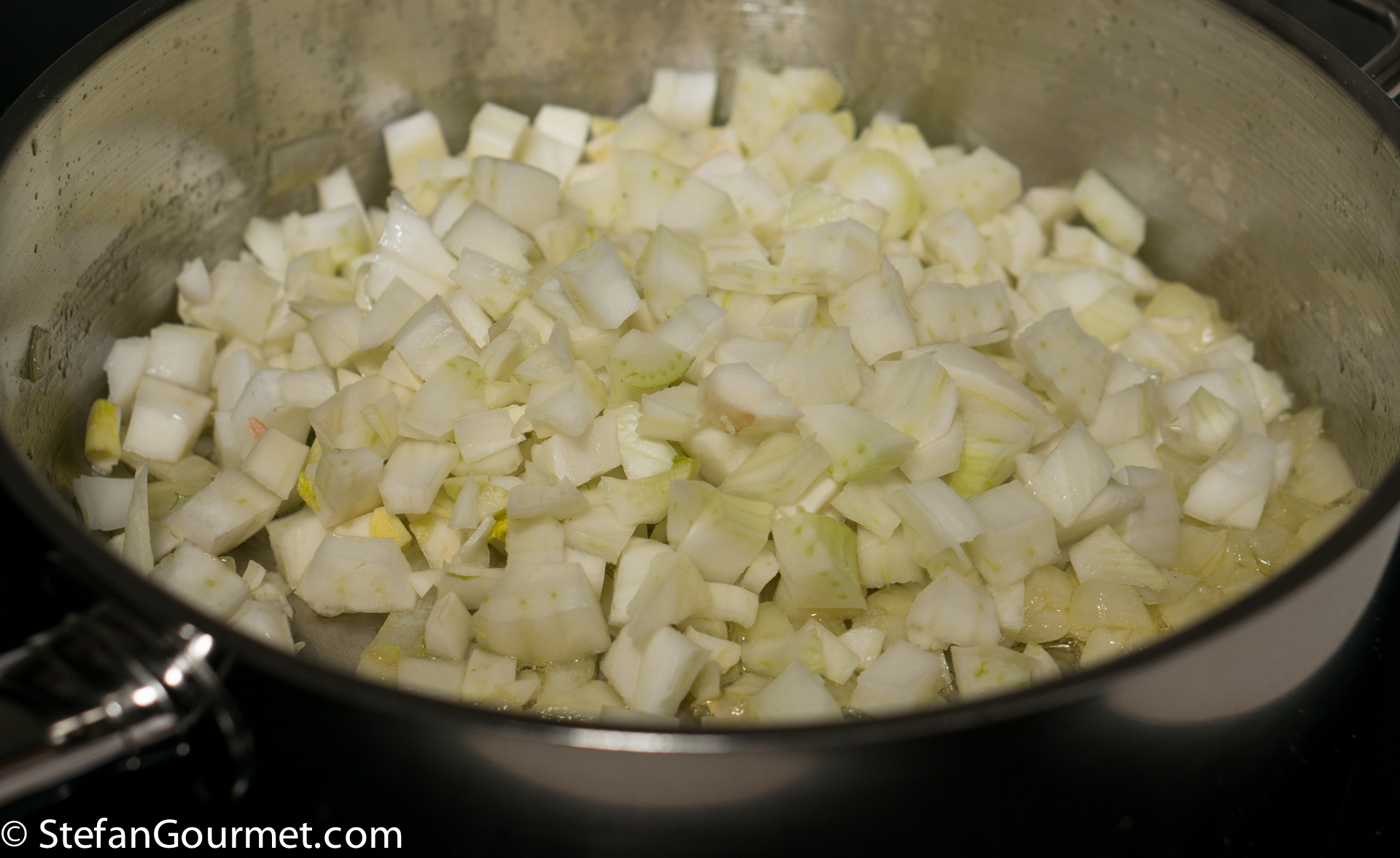 In the meantime, clean and chop the fennel. Add it to the onion and season again with a bit of salt. Stir for a minute over medium heat.