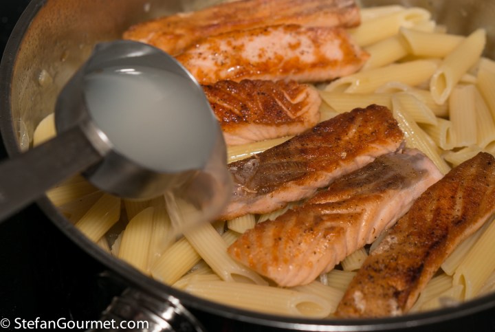 Drain the pasta, reserving a bit of the cooking water. Add the drained pasta and the salmon to the fennel.