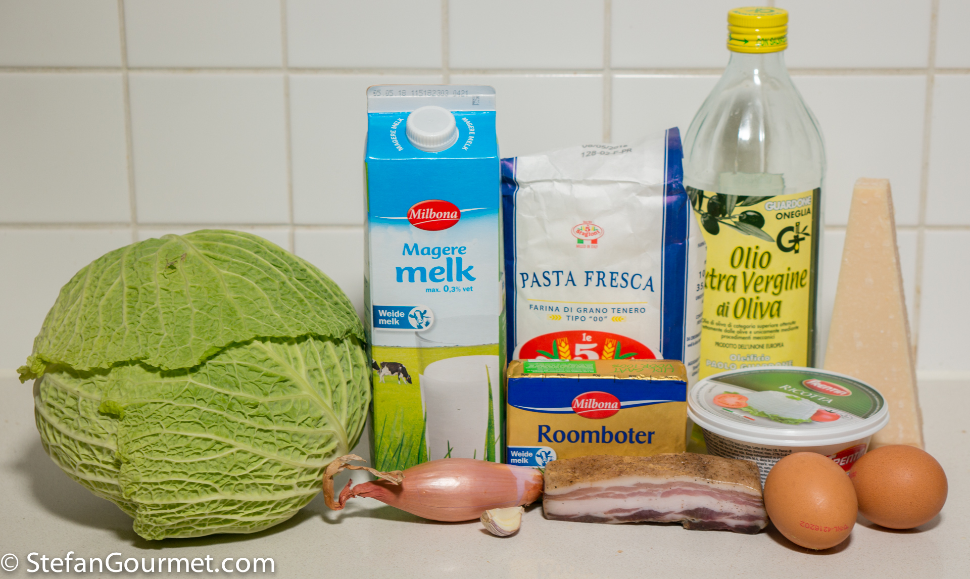 Ravioli and all other shapes of stuffed pasta are my signature dish, so I am always excited when I see a new traditional recipe that I did not know yet. Like the savoy cabbage tortelli I saw on Simona’s blog Grembiula da Cucina. She is from the region of Reggiana, part of Emilia-Romagna, and writes about the recipes from her region. Tortelli are the typical stuffed pasta shape from that region, but if you prefer the recipe would also be fine for regular square ravioli. I followed Simona’s recipe almost exactly, except that I braised the cabbage rather than boiling it. In this way, more of the flavor is preserved. These tortelli are very flavorful and worth the effort. Once you’ve made your own stuffed fresh pasta, you’ll never go back to the supermarket version (which often tastes like cardboard).