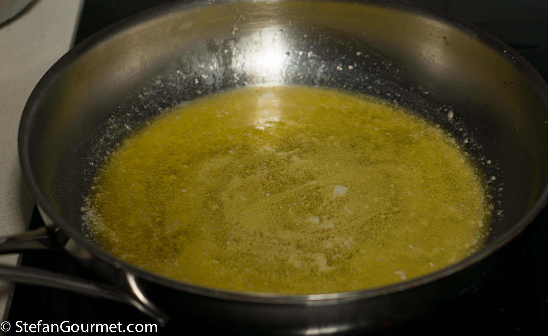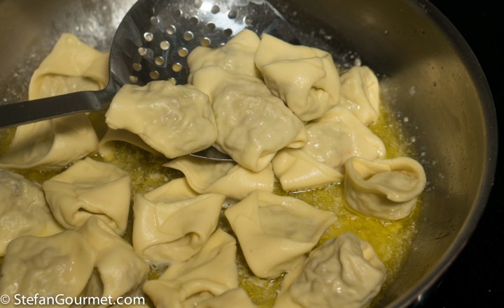The tortelli only need a couple of minutes. Lift them out of the water with a strainer, and add them to the melted butter.